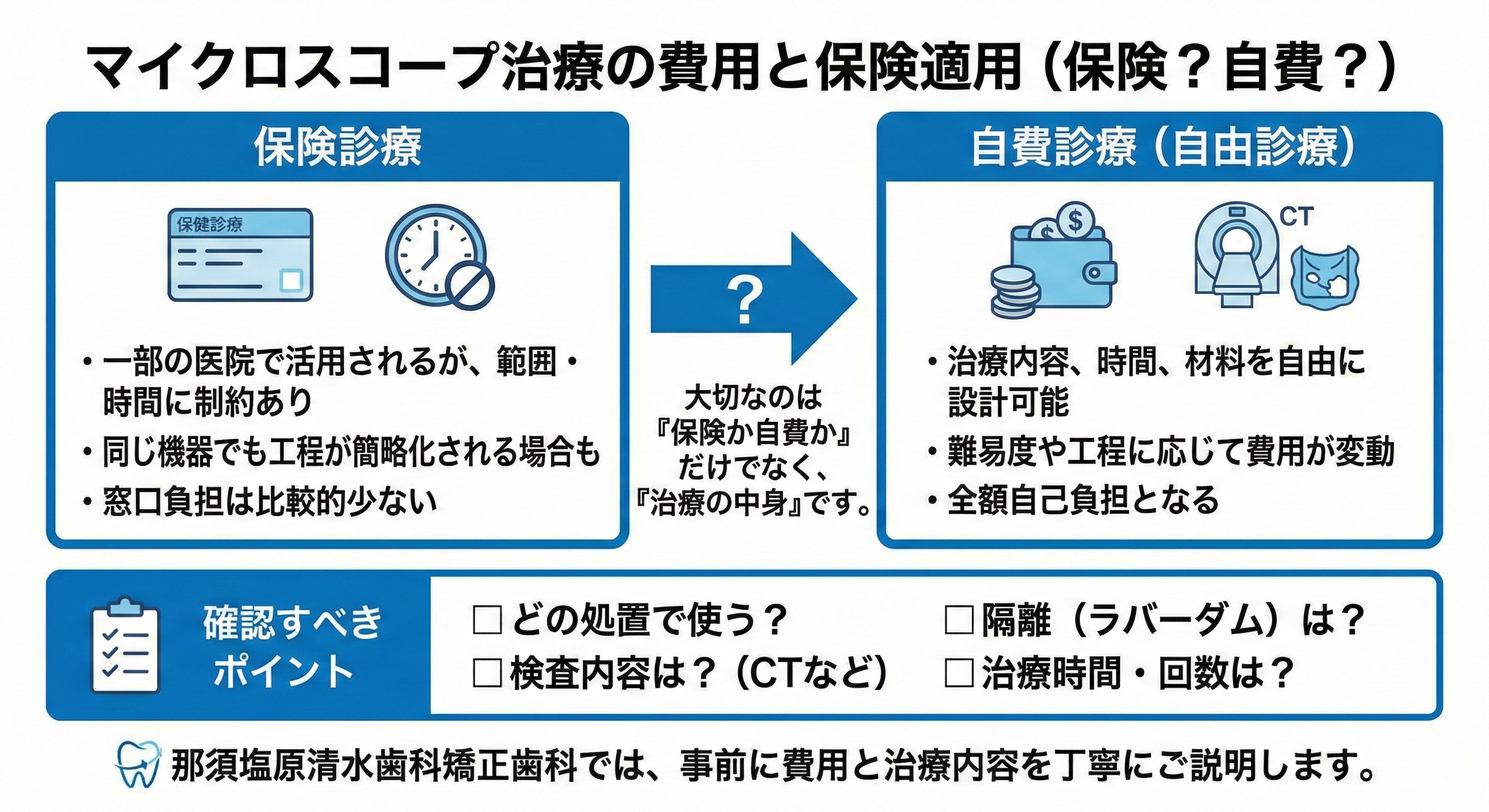 マイクロスコープを使う治療は、時間がかかる、材料や工程が増える、隔離などの準備が必要になるといった理由で、自由診療になるケースがあります。