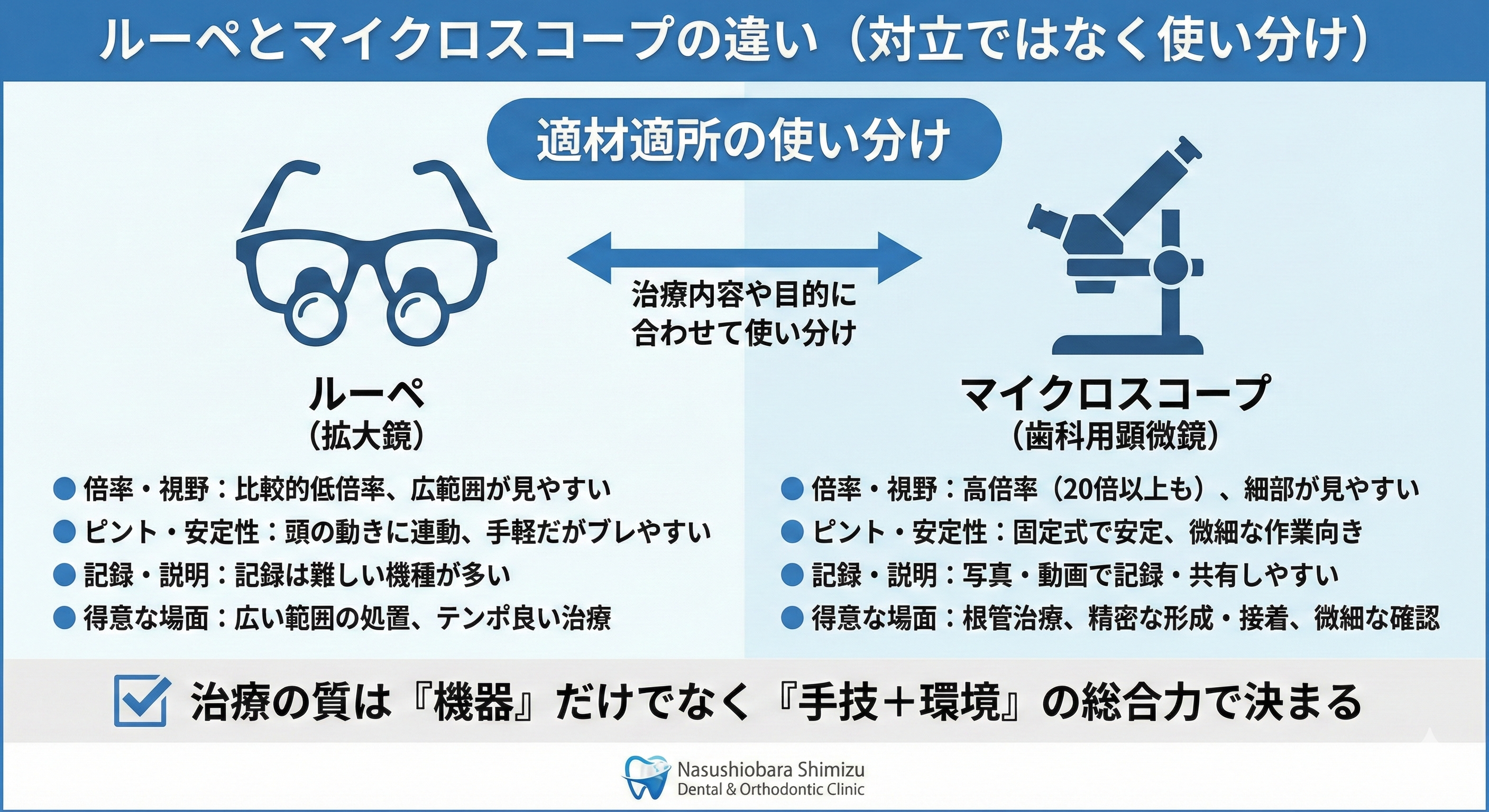 ルーペとマイクロスコープは対立ではなく、目的に合わせた使い分けが基本です。患者さん側は倍率だけに注目しがちですが、視野の安定、ピントの合わせやすさ、記録性なども含めて理解すると混乱しにくくなります。