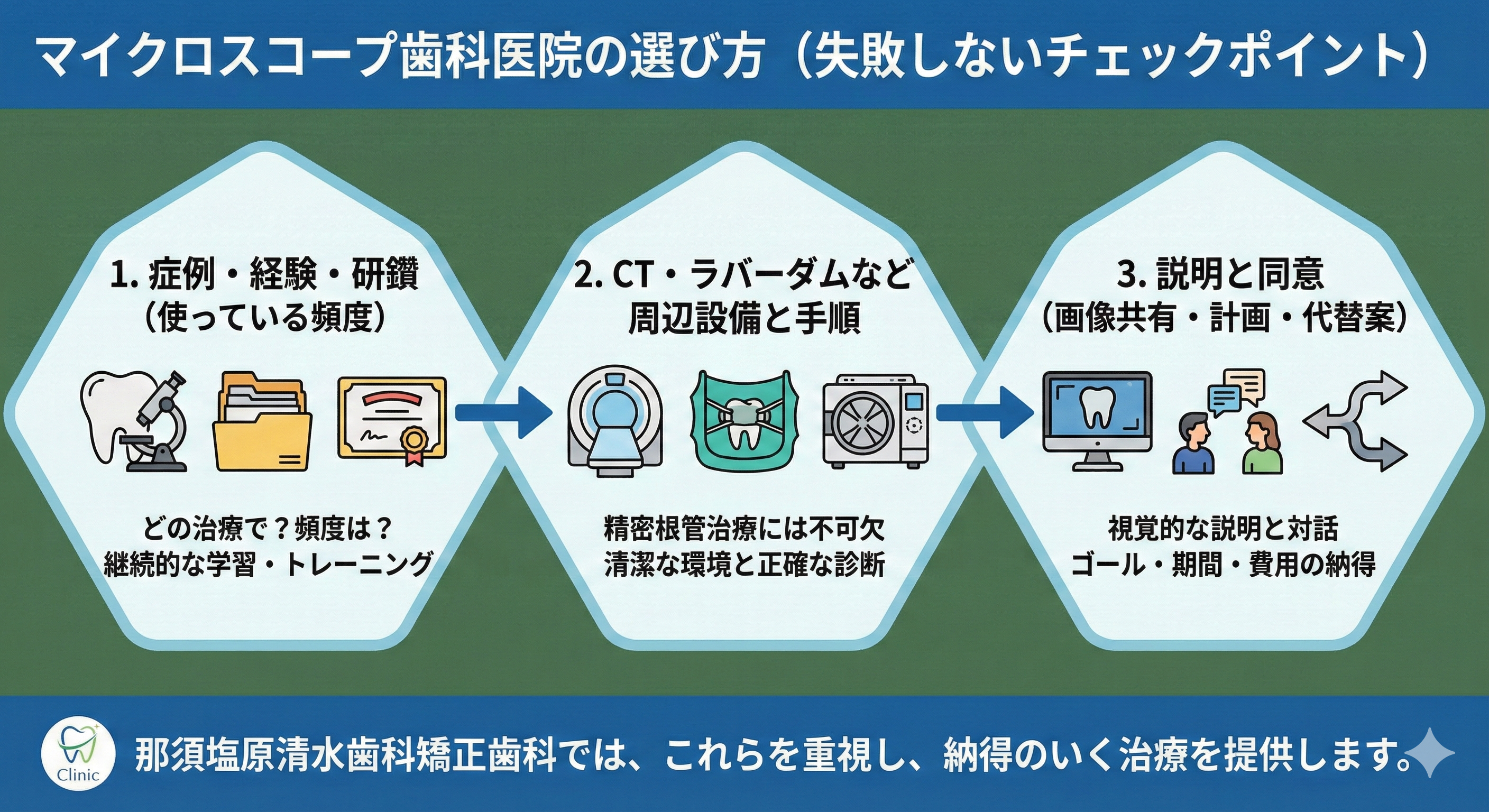 ただし治療の質は、設備だけでなく手技・診断・材料・隔離などの総合力で決まります。マイクロスコープは、その総合力を支えるための道具と考えると納得しやすいです。