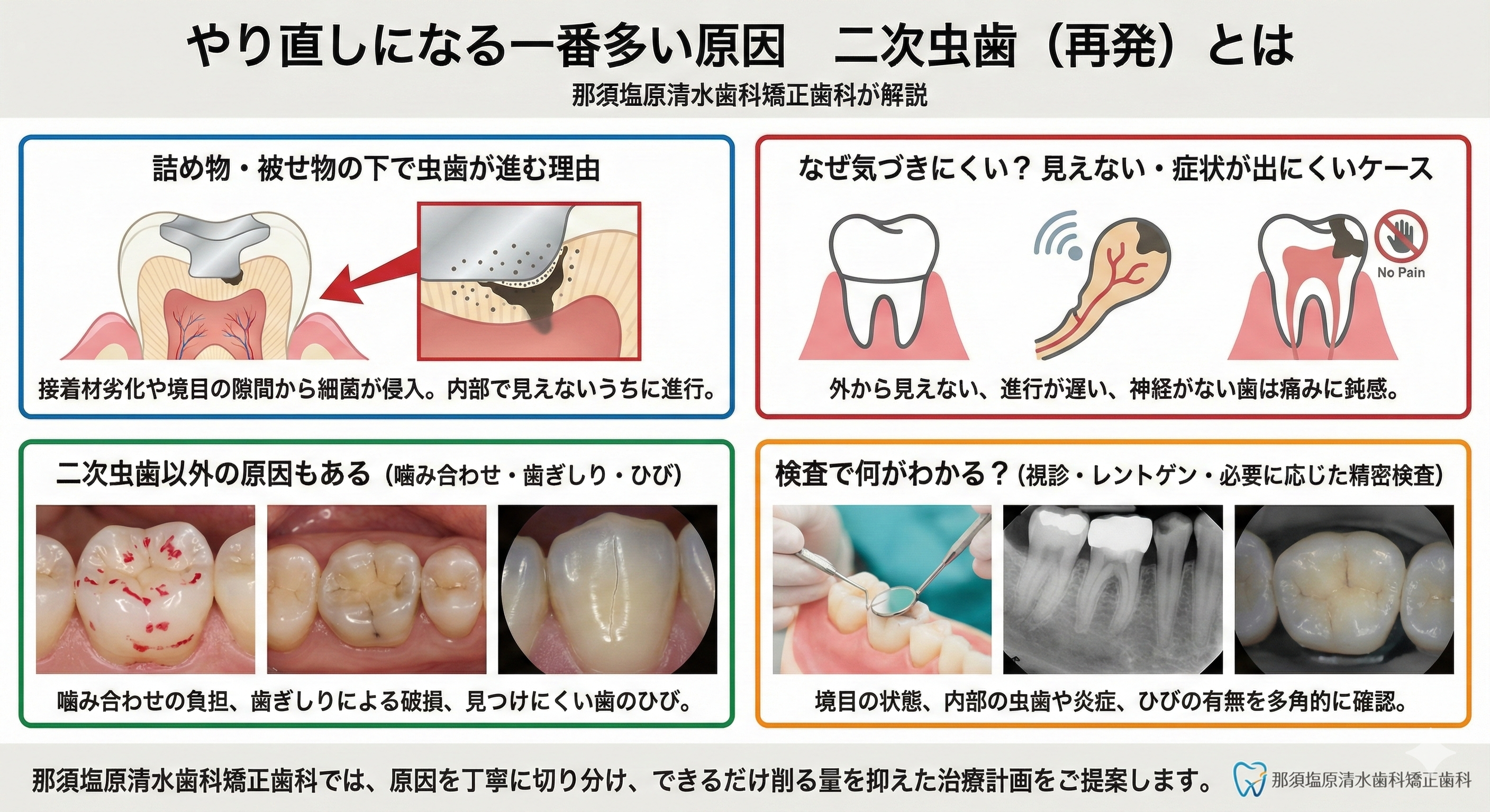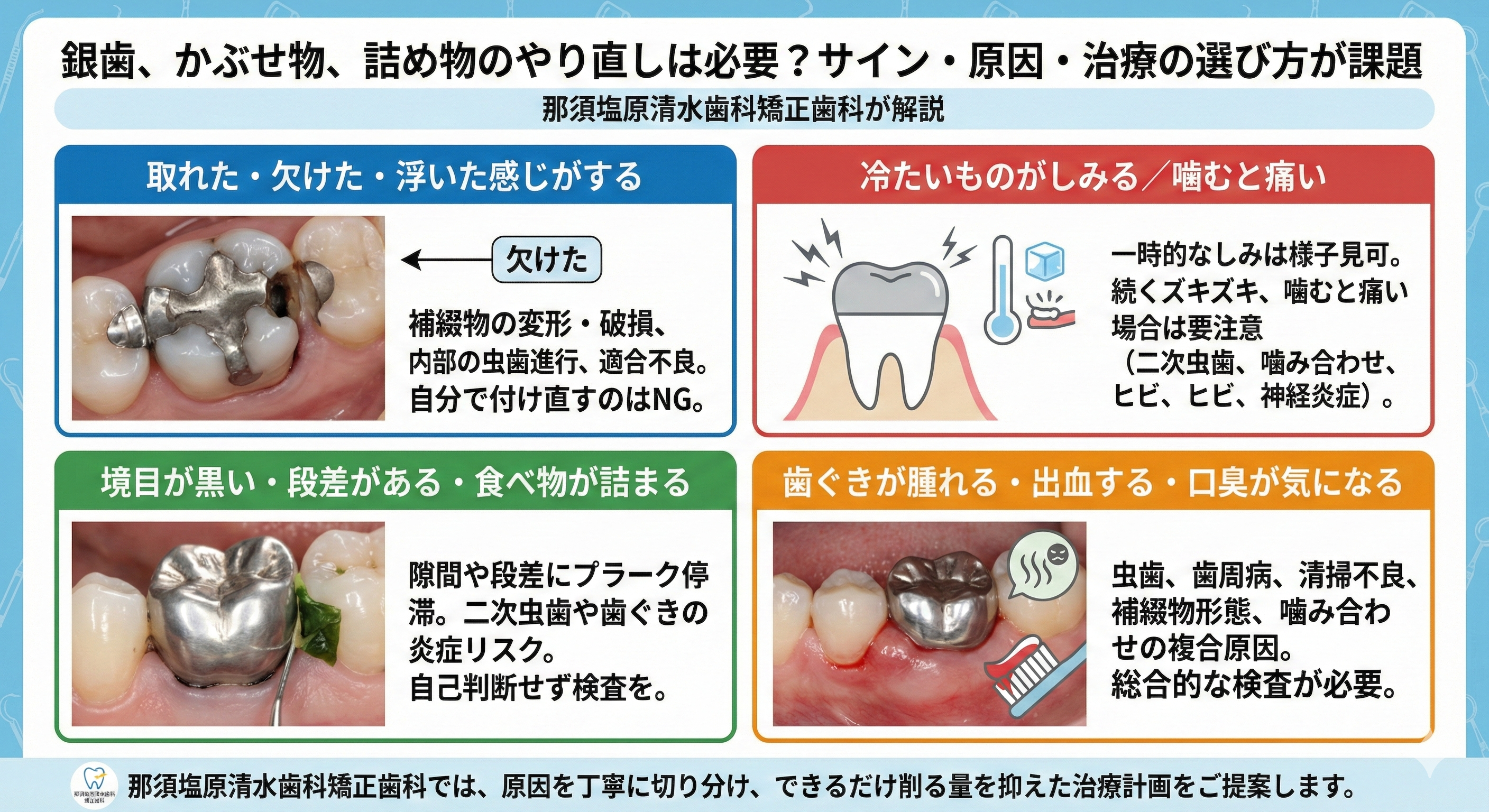 この記事では、銀歯・かぶせ物・詰め物のやり直しが必要になるサイン、最も多い原因である二次虫歯の仕組み、治療の選択肢と素材選び、再発を減らすコツまでを順に整理します。那須塩原清水歯科矯正歯科でも、症状だけで決めつけず、検査で原因を丁寧に切り分けたうえで、できるだけ削る量を抑えた治療計画を提案できるよう心がけています。
