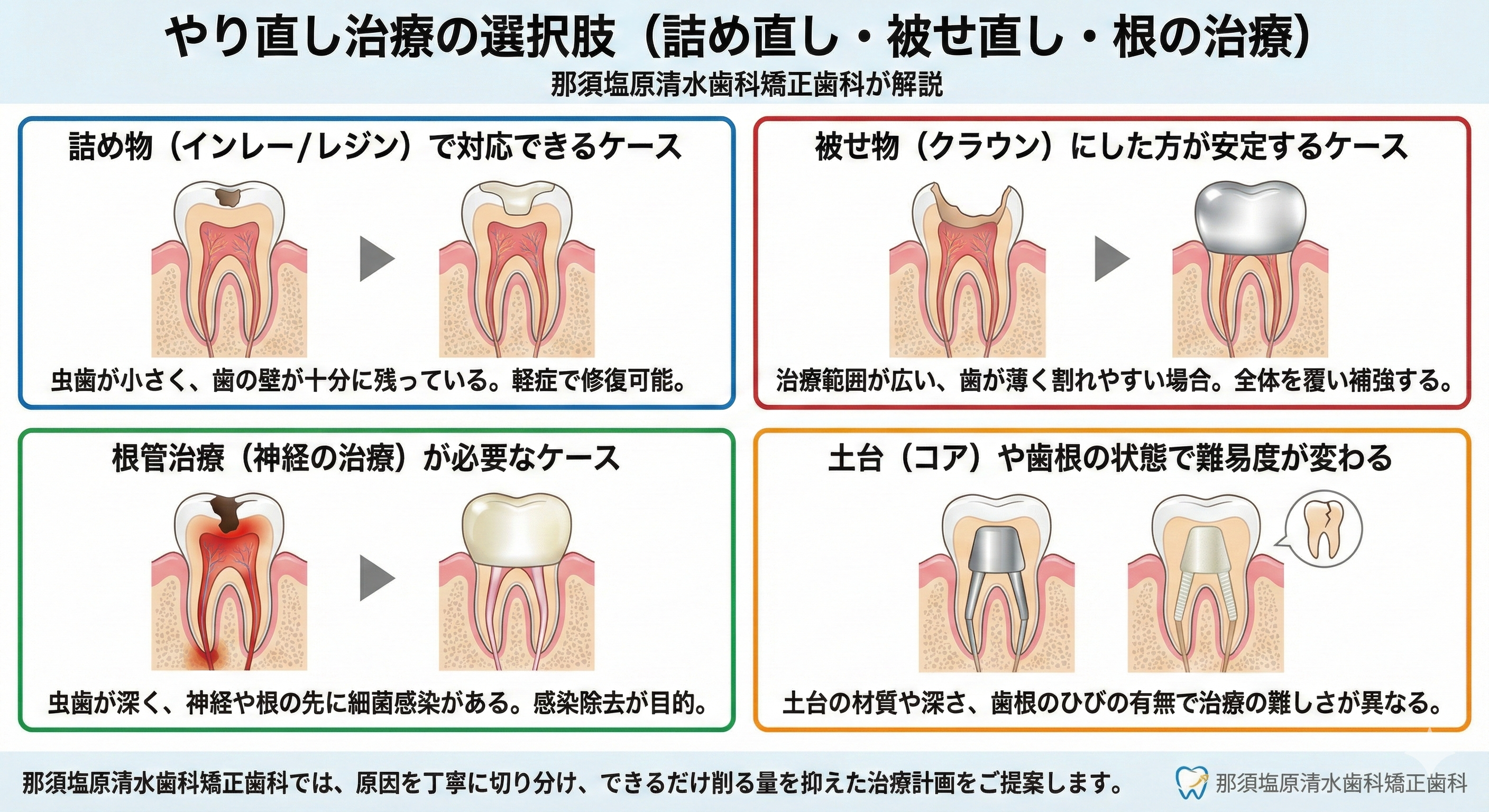 やり直し治療の選択肢(詰め直し・被せ直し・根の治療)