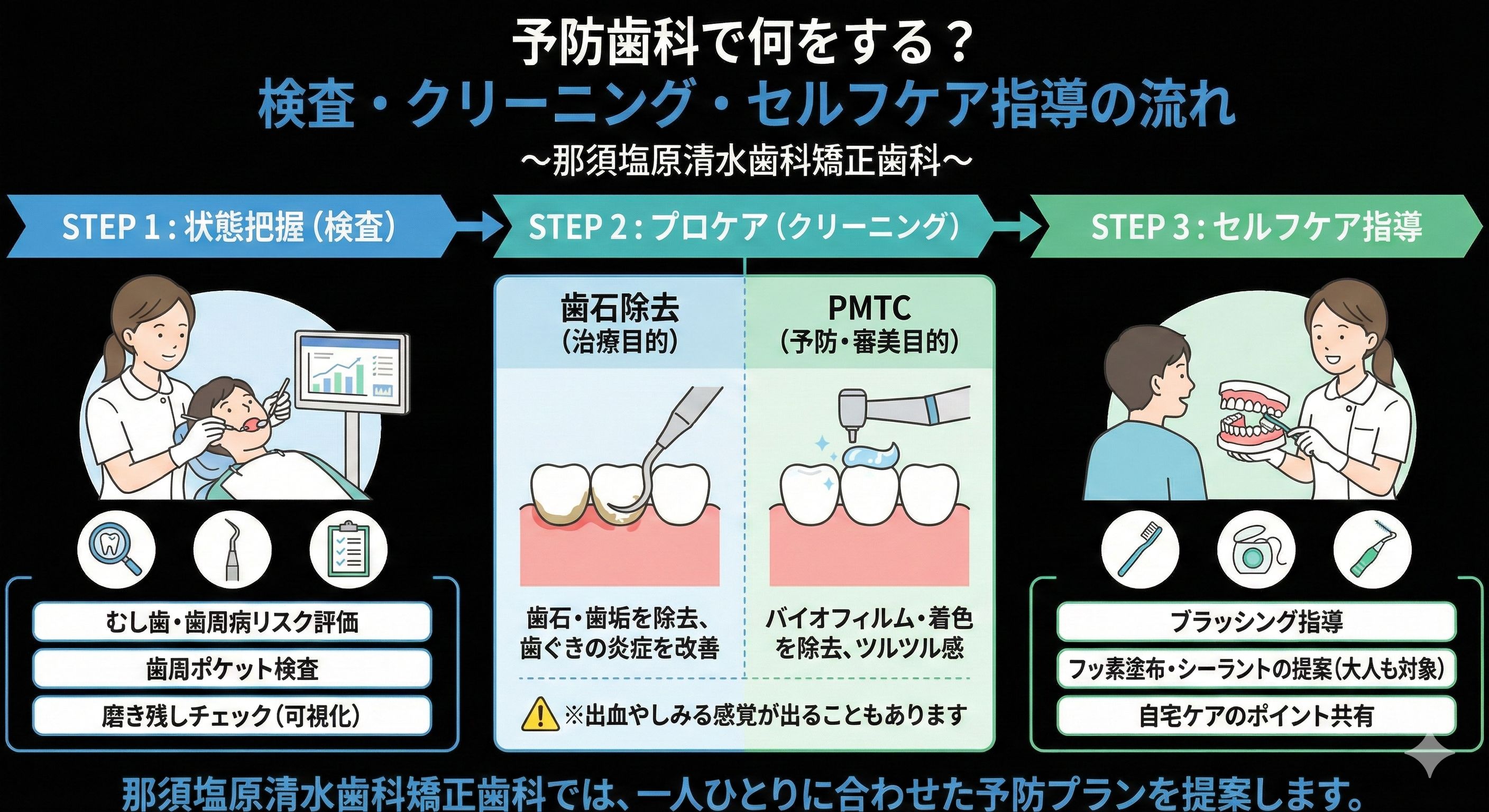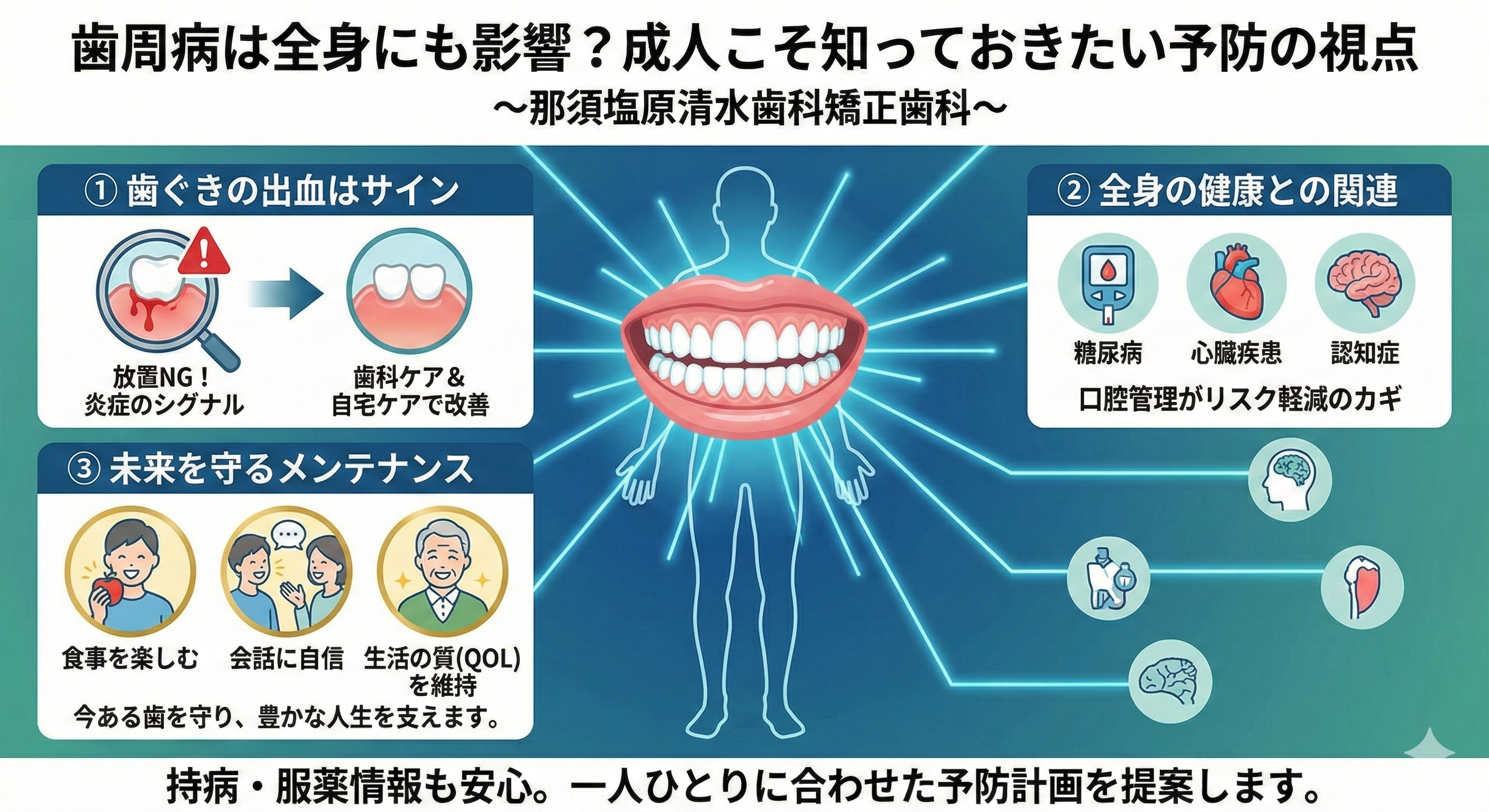 那須塩原清水歯科矯正歯科では、年齢だけで決めつけず、リスクと生活背景を見ながら、その人に必要な予防を提案する方針です。