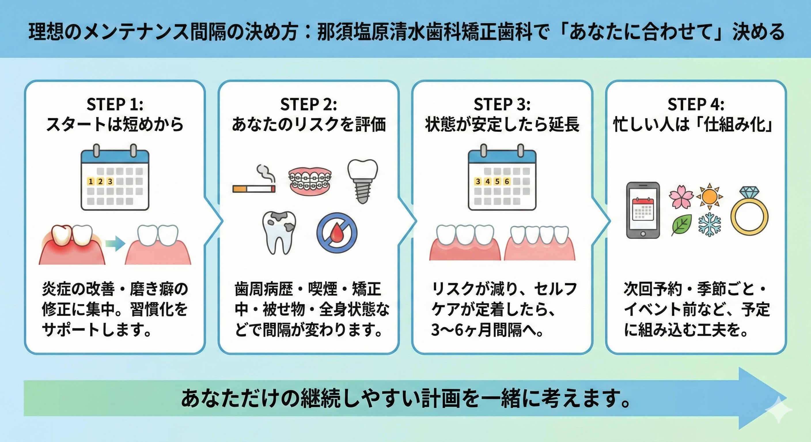 今日からできる行動変容は難しいことではありません。例えば、次回のメンテナンス予約を取って帰る、3〜6か月の区切りで生活の予定に組み込む、イベント前にクリーニングを入れるなど、続ける仕組みを作るだけでも継続しやすくなります。那須塩原清水歯科矯正歯科でも、続けやすい計画づくりを一緒に考えていきます。