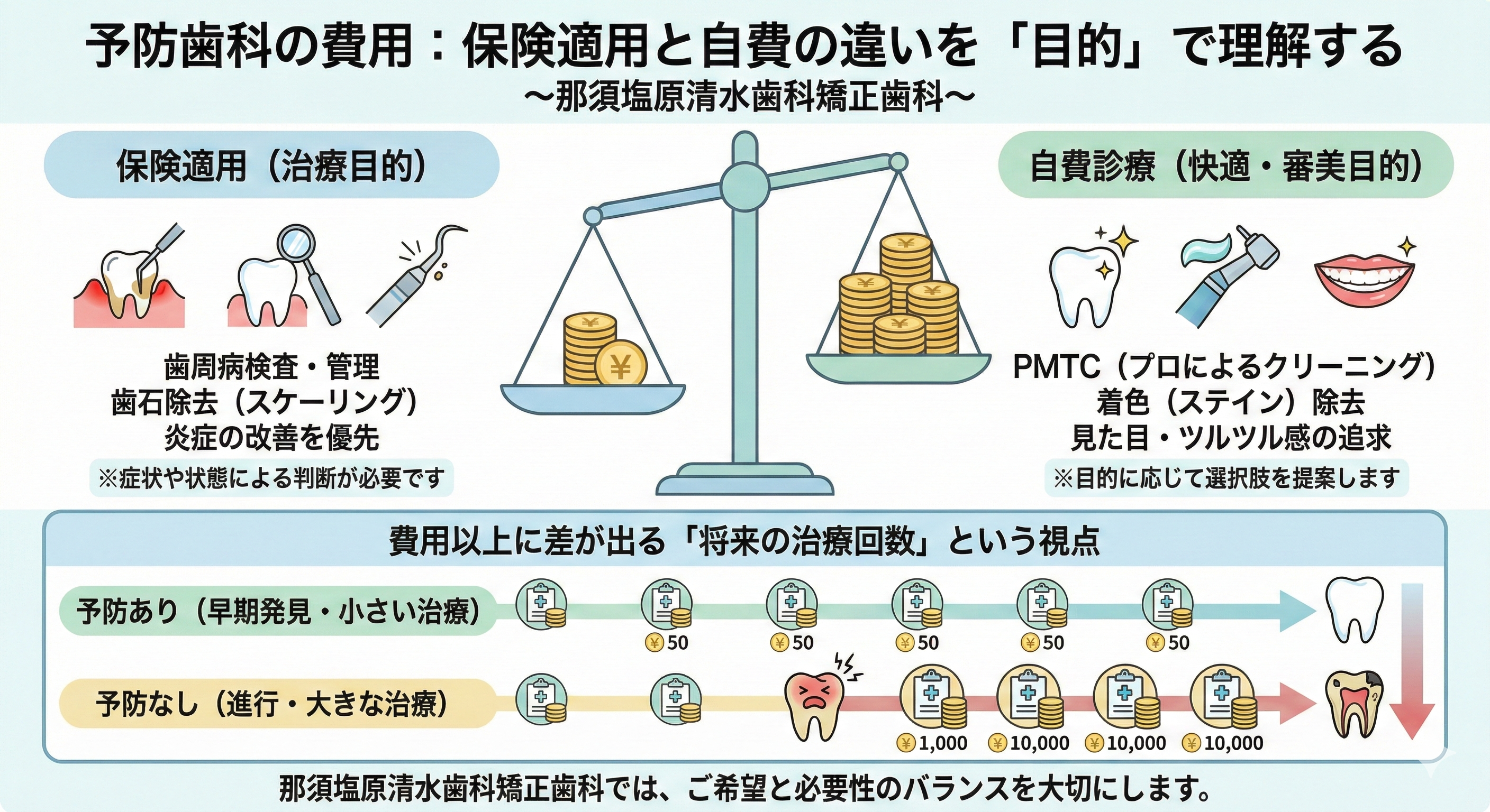 予防歯科は、内容や目的によって費用の考え方が変わるため、ここを誤解なく理解しておくことが大切です。ポイントは、治療として必要な管理なのか、快適さや見た目の改善を目的としたケアなのかで変わりやすいという点です。