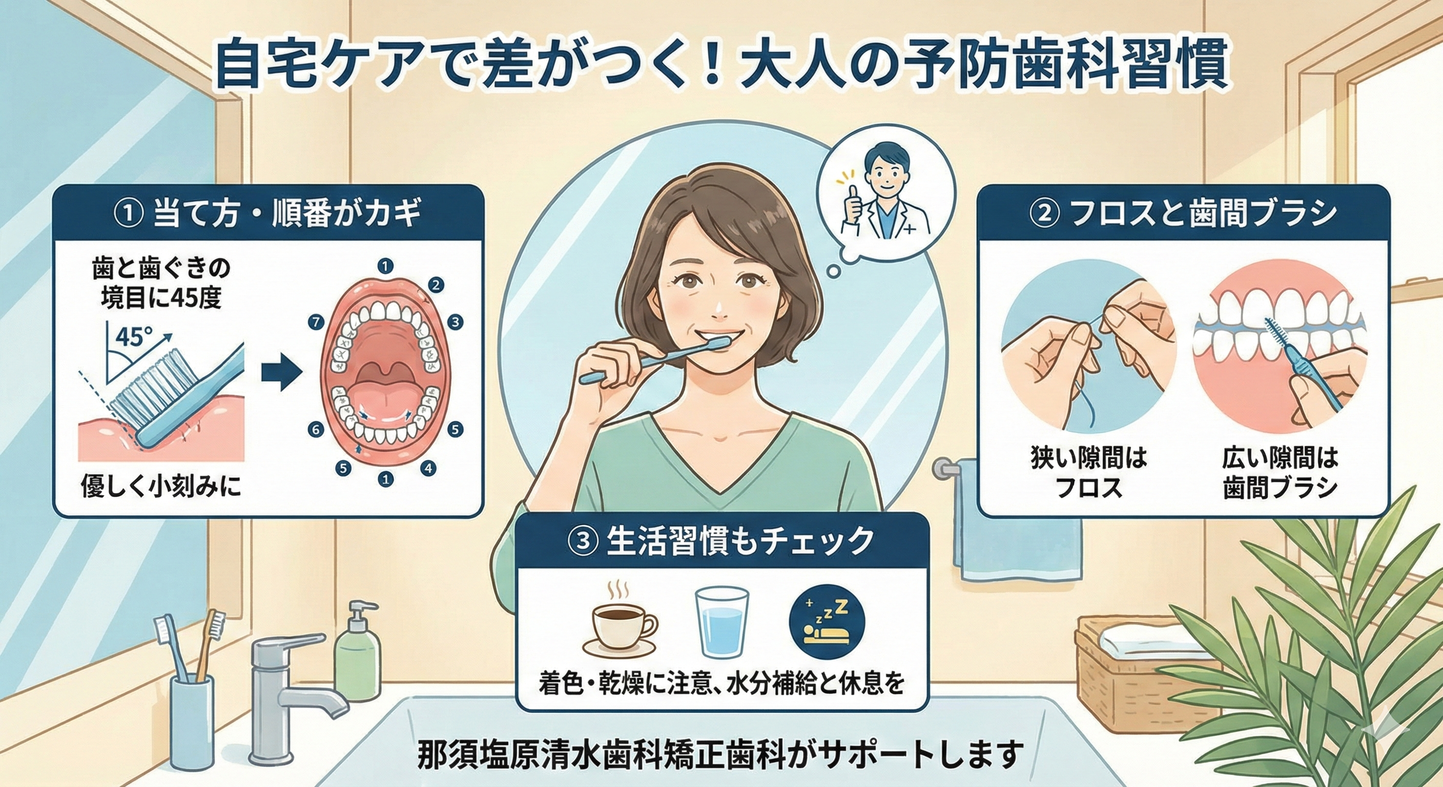 医院でのケアはリセット、自宅ケアは維持という役割分担で考えると、予防は続けやすくなります。どれだけクリーニングで整えても、毎日の磨き方が自己流のままだと、汚れは同じ場所に溜まりやすいからです。