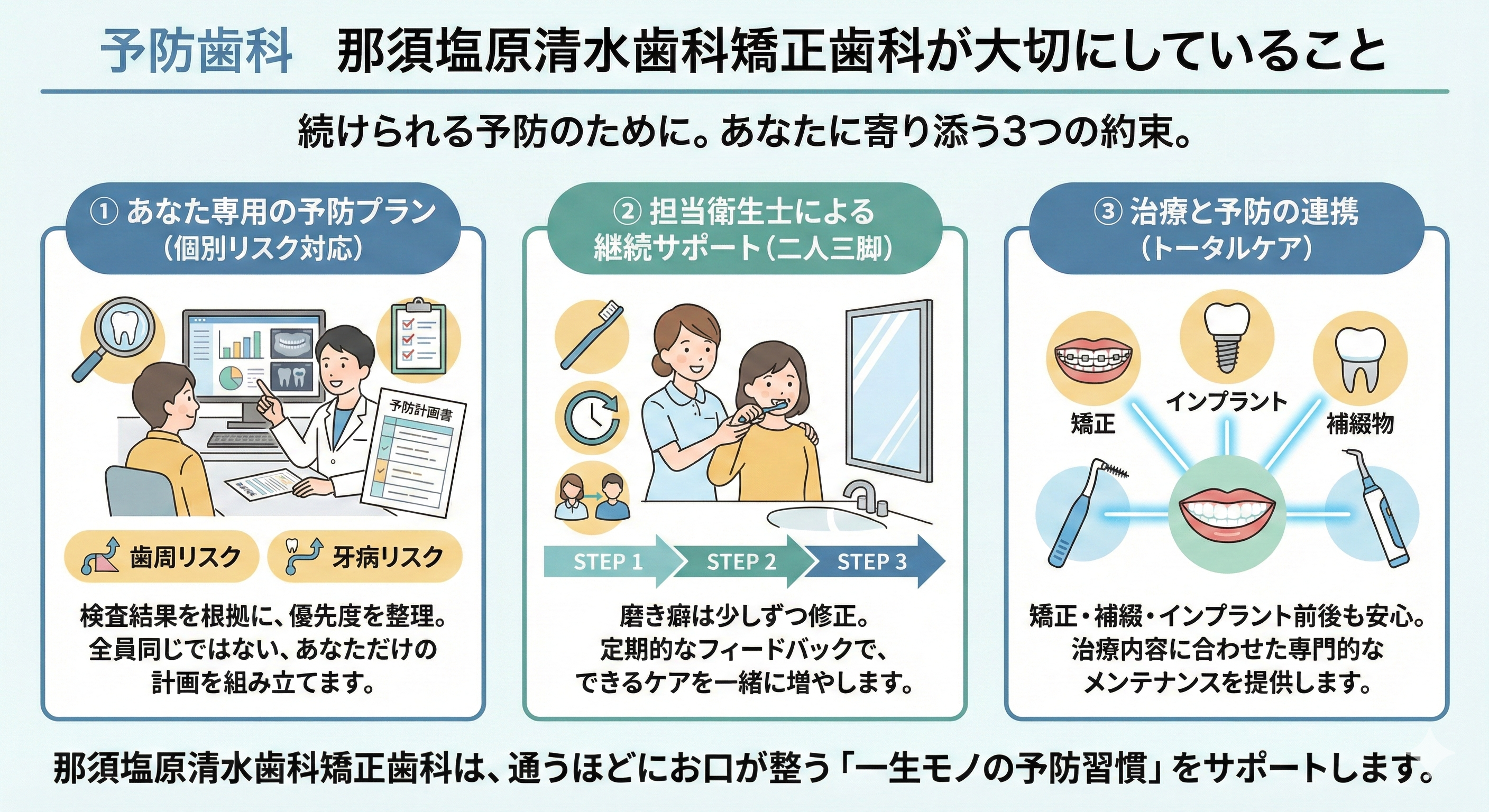 那須塩原清水歯科矯正歯科では、継続サポートを通じて、できるケアを増やし、予防を習慣として定着させることを目指します。