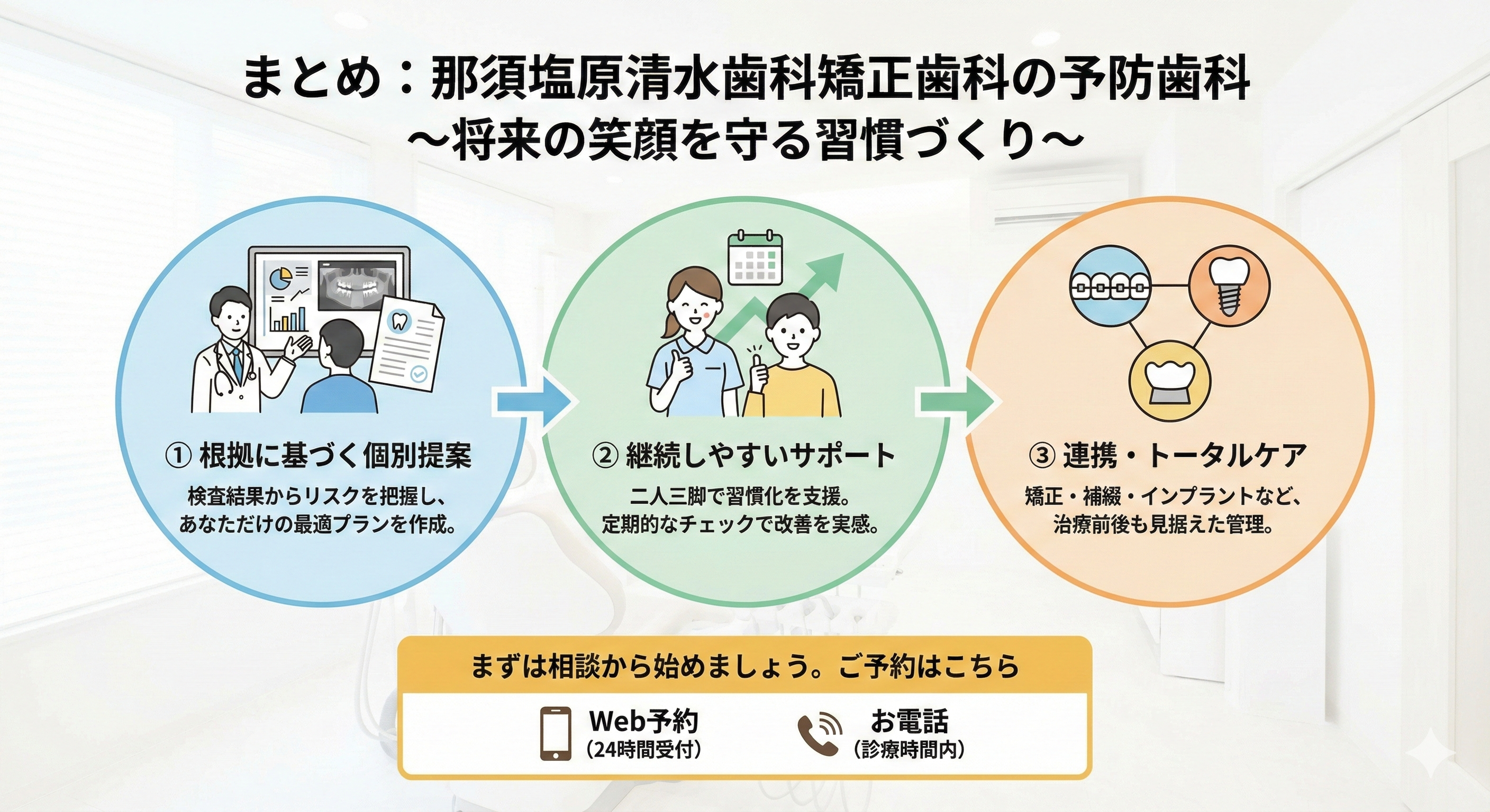 那須塩原清水歯科矯正歯科では、検査結果を根拠にした個別提案、継続しやすいサポート、矯正や補綴、インプラント前後まで見据えたメンテナンス連携を大切にしています。相談・カウンセリングのご予約は、Web予約またはお電話からご案内します。