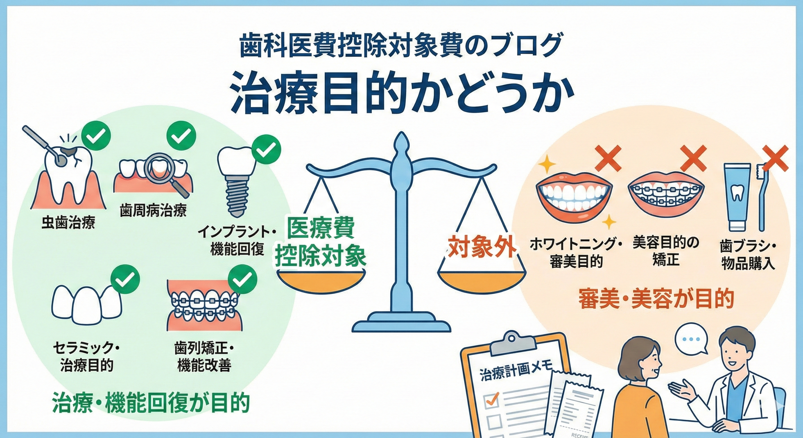 歯科の医療費控除で一番大事なのは、治療目的かどうかです。見た目を整える意図が強い場合は対象外になりやすく、噛む・話すなど機能回復や疾病治療として必要性がある場合は対象になり得ます。