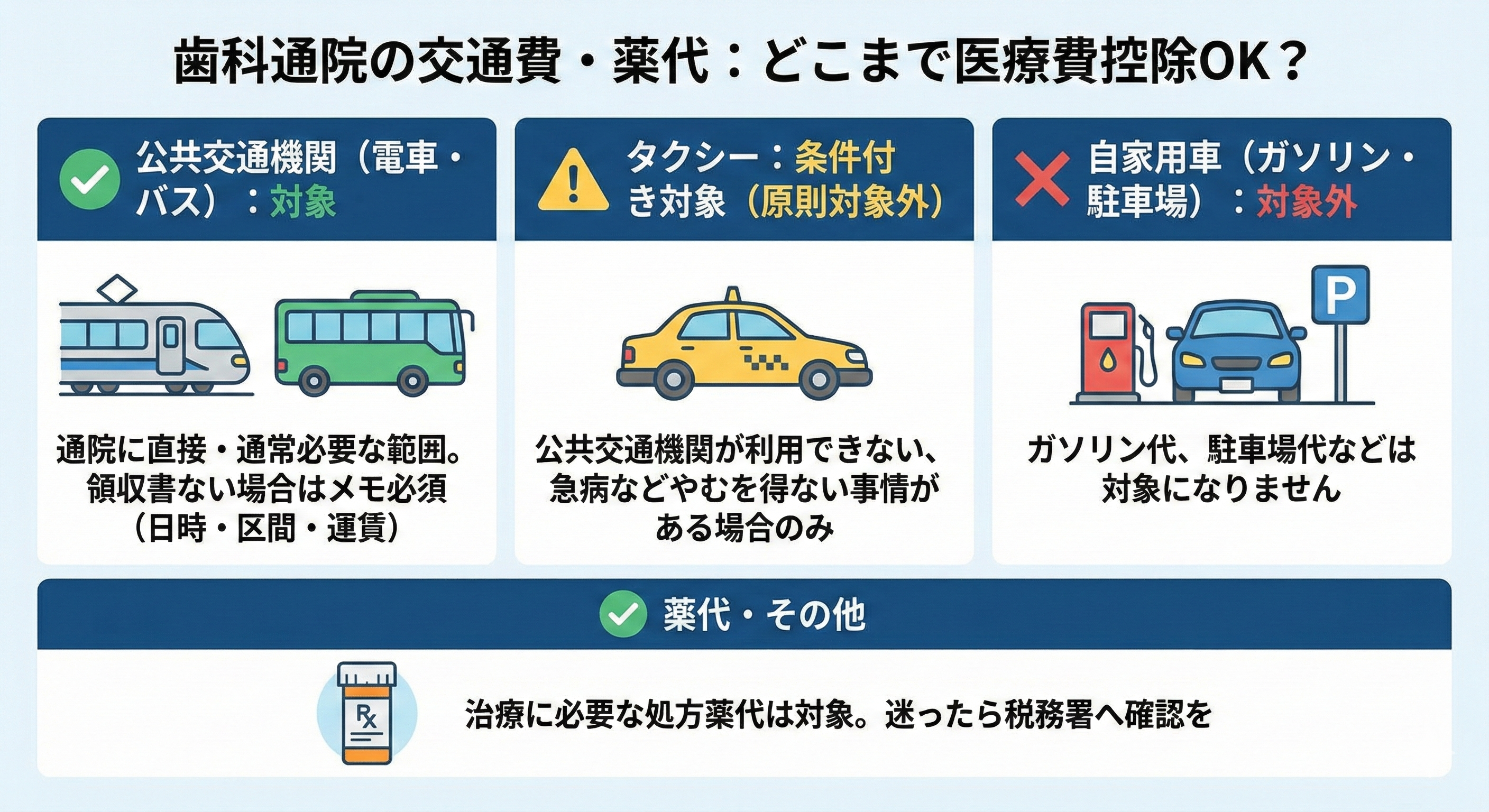 歯科は複数回通院が必要になりやすく、交通費の扱いが意外と大きな差になります。結論から言うと、通院のために直接必要で、かつ通常必要な範囲の交通費は対象になり得ます。一方で、自家用車の費用は対象になりにくいなど、線引きがあります。