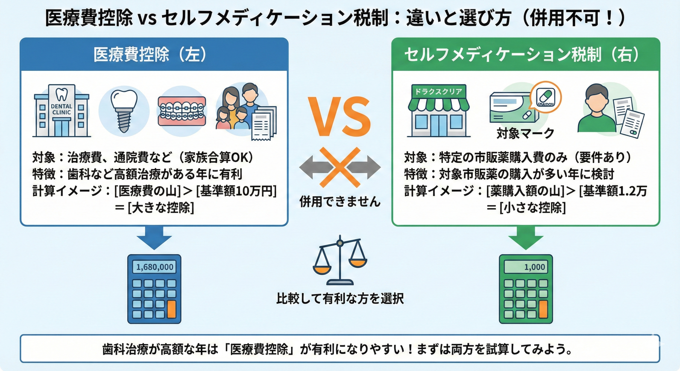 歯科は治療費がまとまって大きくなりやすい年があるため、医療費控除を中心に検討するケースが多いですが、市販薬の購入が多い年は比較が必要になります。