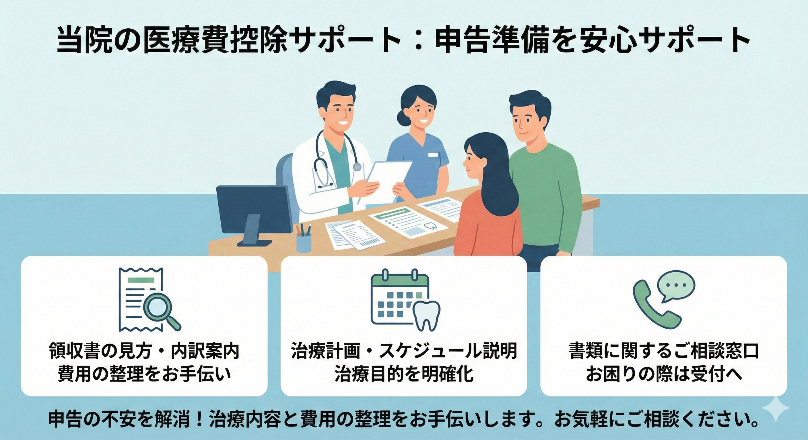 税務上の最終判断は税務署等になりますが、少なくとも治療内容と費用内訳が整理できていれば、確認もスムーズになります。申告の準備で不安があれば、受診時やカウンセリングの際に気軽にお声がけください。