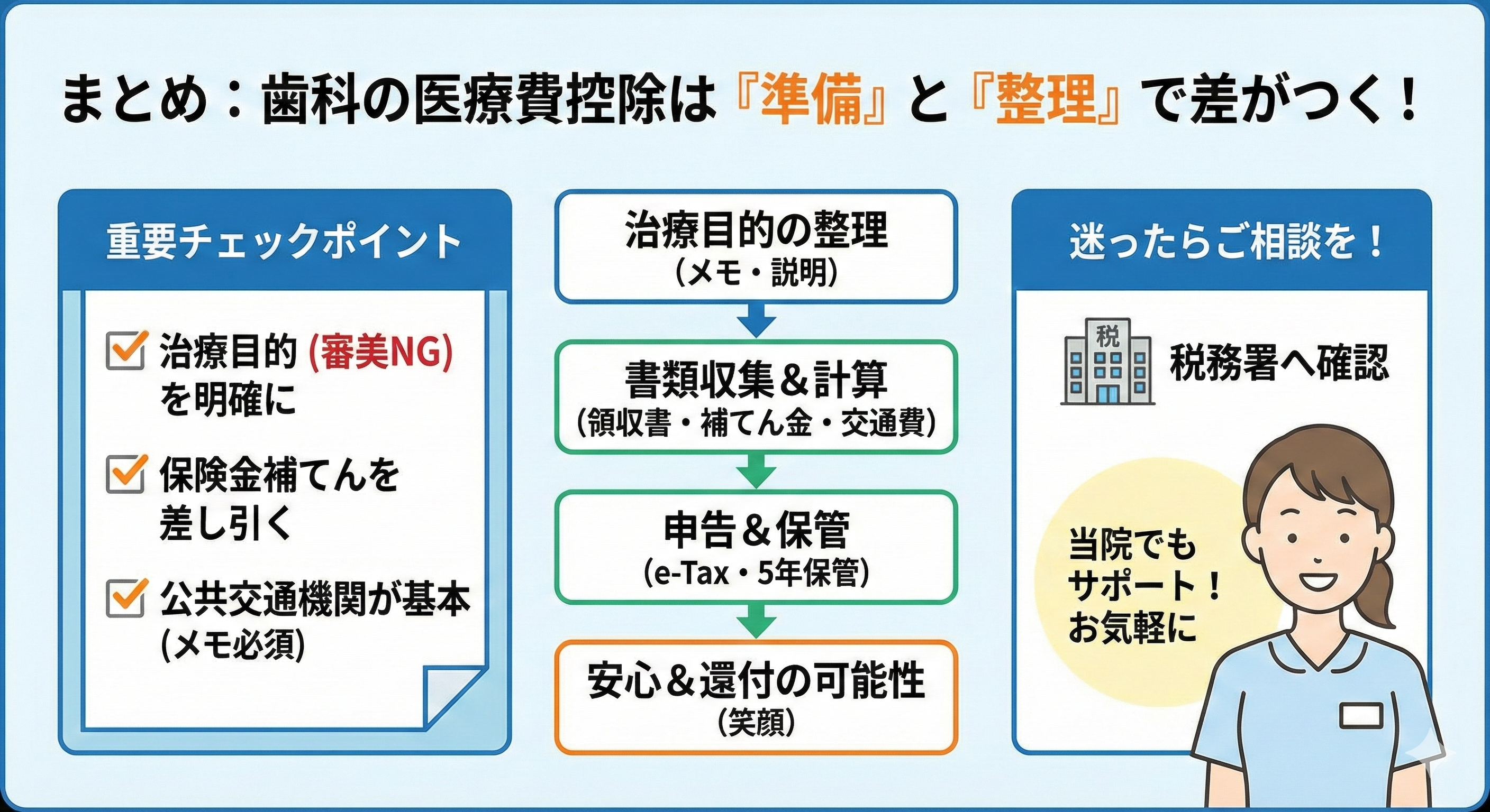まとめ:歯科の医療費控除は治療目的の整理と準備で差がつく