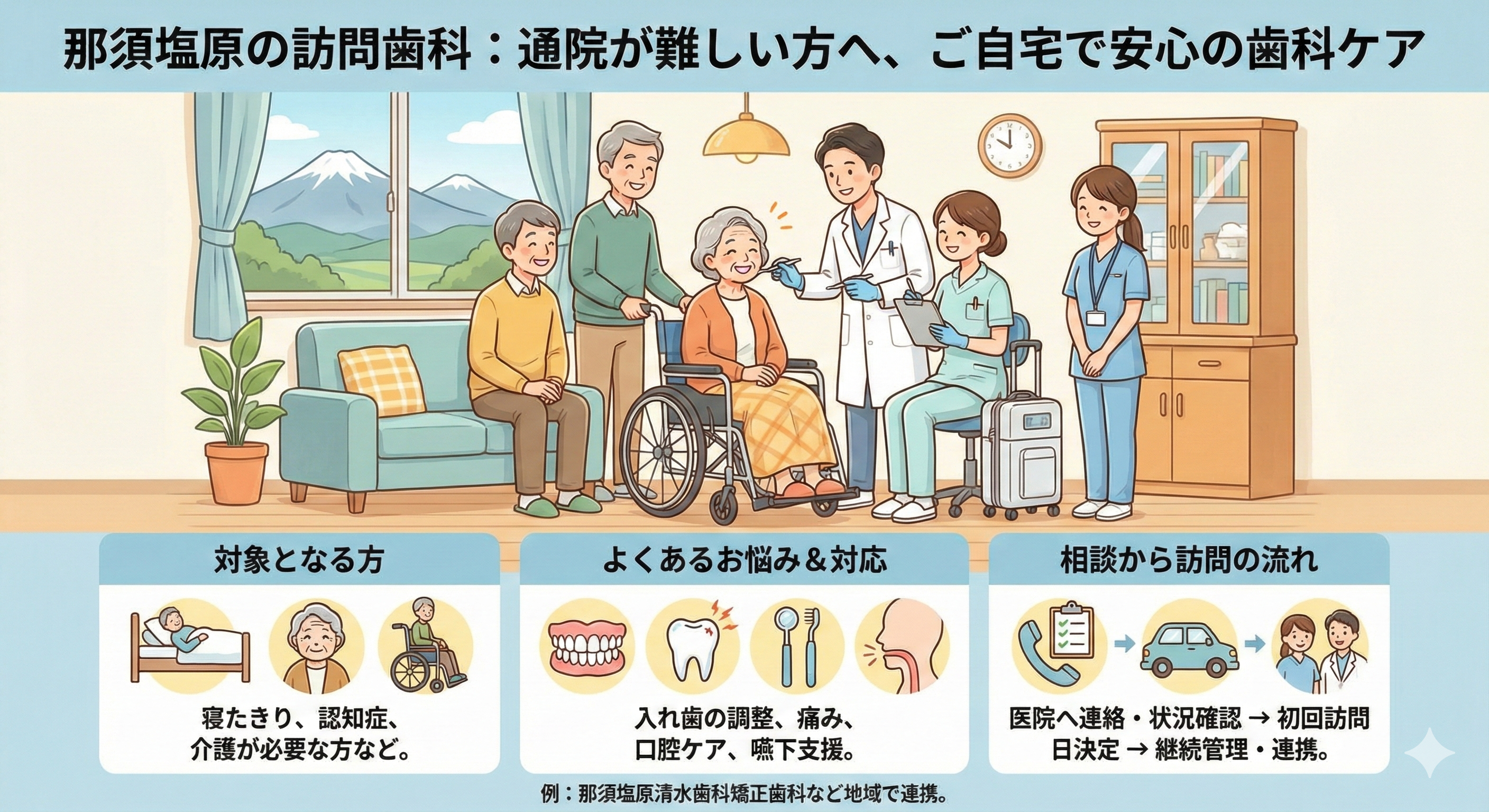 那須塩原で訪問歯科を検討する方は、自宅か施設か、どの程度まで処置ができるか、継続的に見てもらえるかを気にする傾向があります。那須塩原清水歯科矯正歯科のように、地域で訪問診療に対応する医院に相談することで、生活の中で起きている困りごとを起点に、治療とケアを組み合わせた提案を受けやすくなります。