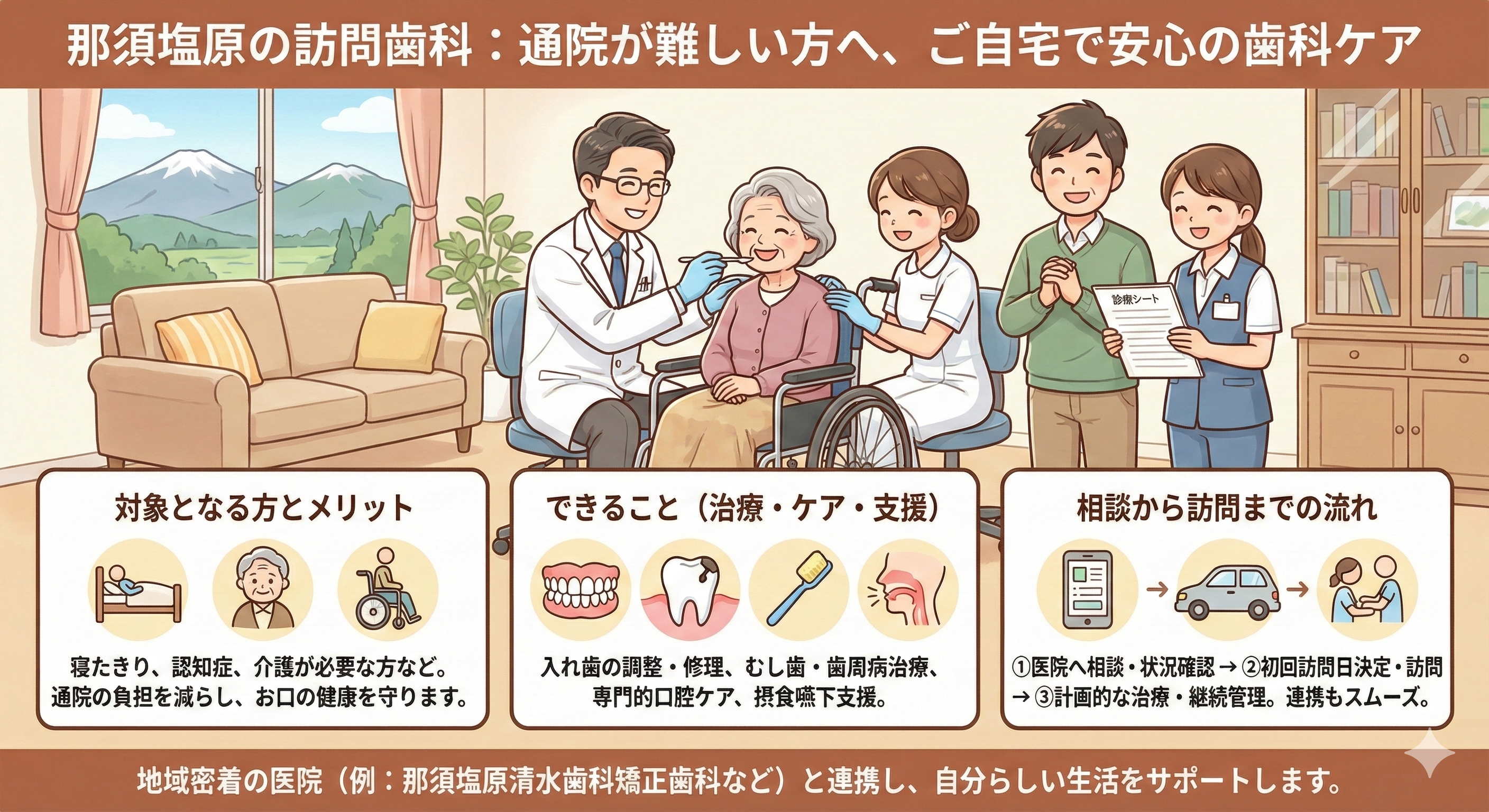 この記事では、訪問歯科の対象者、診療内容、保険と費用の考え方、申し込みから初回訪問までの流れを整理して解説します。那須塩原清水歯科矯正歯科のように、地域で訪問診療に対応する歯科医院へ相談する際に、何を準備し、どう確認すればスムーズかも具体的にまとめます。通院が難しくなっても、食べること、話すこと、お口の清潔を守るための一歩として、ぜひ参考にしてください。