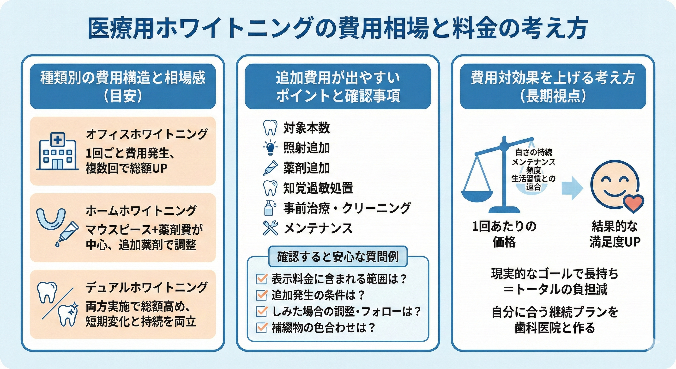 ホワイトニングの不安で多いのが、費用が分かりにくいことです。料金は医院や地域、薬剤、回数、方法によって差が出るため、相場だけで判断するとギャップが生まれやすくなります。大切なのは、相場感を踏まえたうえで、料金に何が含まれているか、追加が出る条件は何かを確認することです。