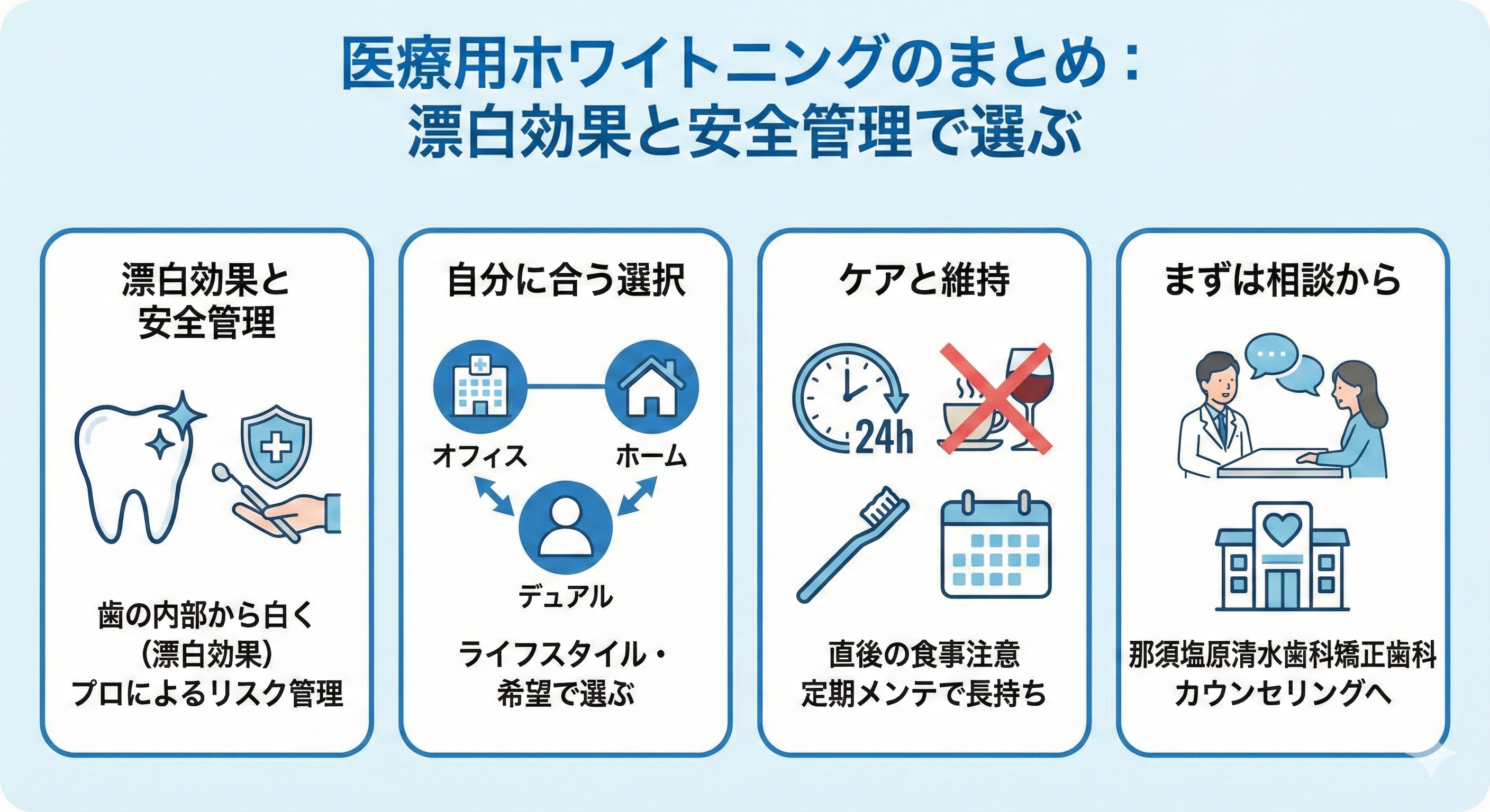 まとめ:医療用ホワイトニングは漂白効果と安全管理で選ぶ