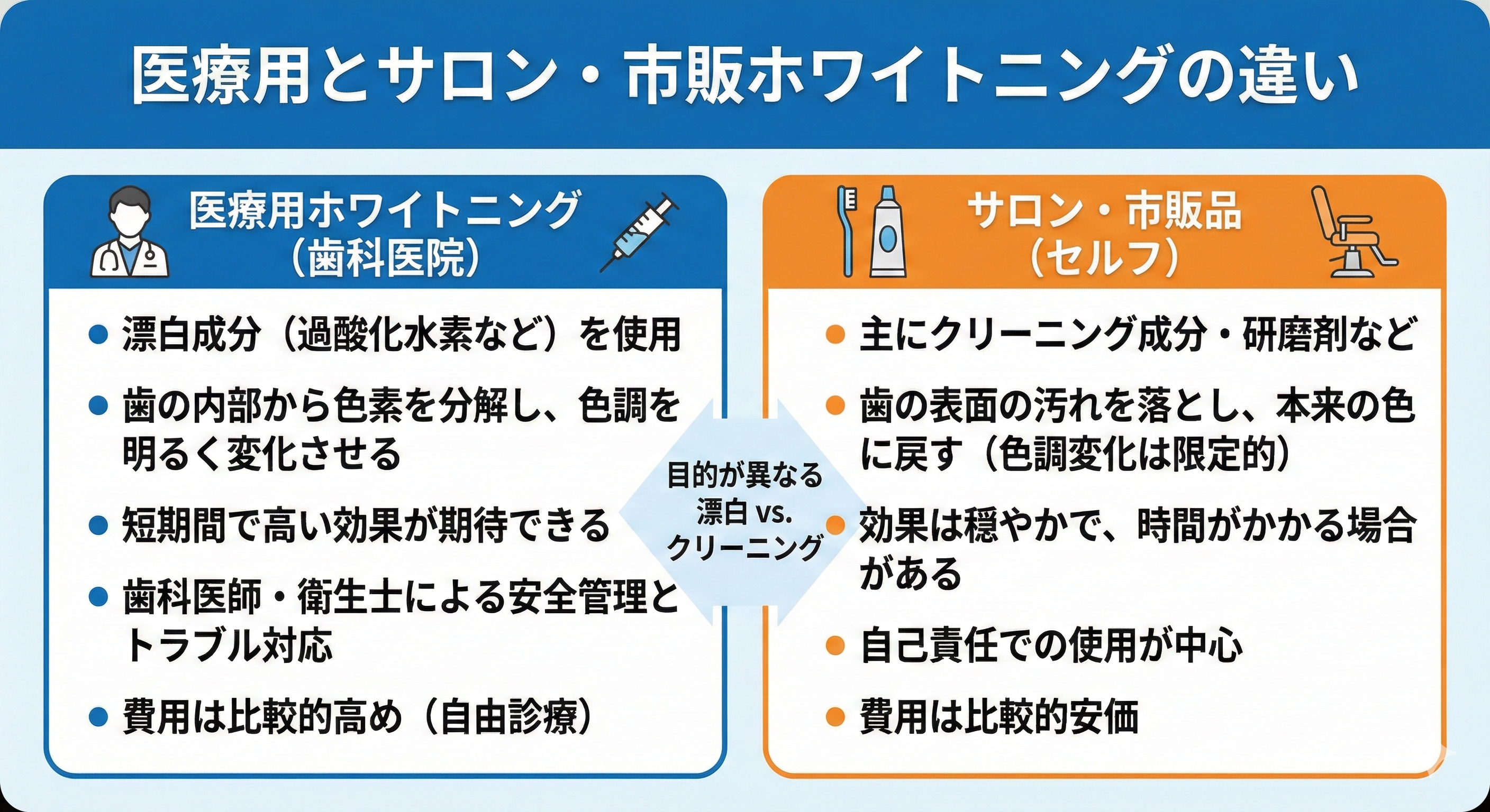医療用ホワイトニングは、歯科医院で取り扱う薬剤を用い、歯の色素に働きかける漂白を目指します。一方、サロンや市販品は、主に歯の表面の汚れにアプローチするものが中心で、歯そのものの色調を大きく変えることには限界があります。