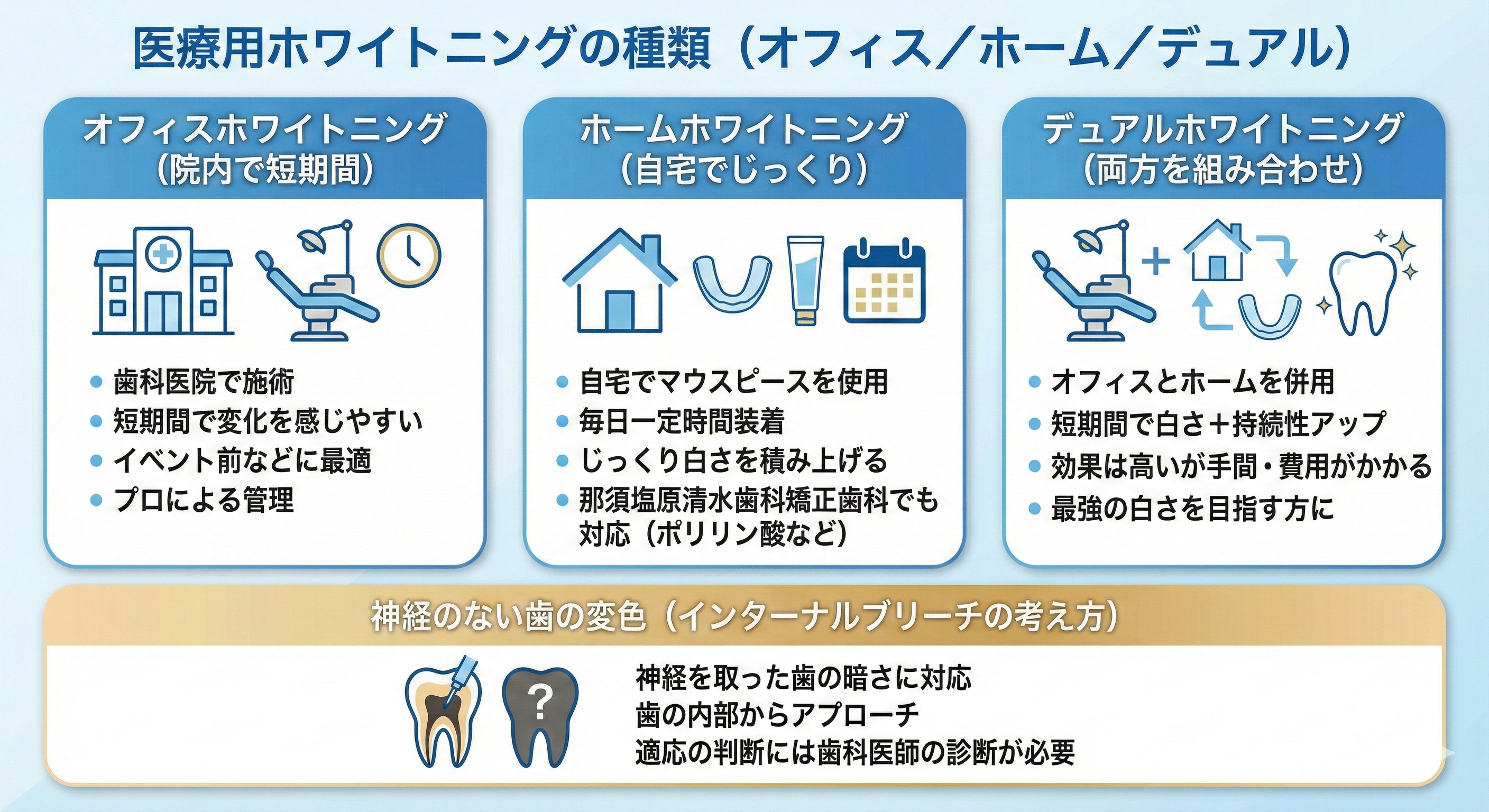 医療用ホワイトニングは大きく分けて、オフィスホワイトニング、ホームホワイトニング、デュアルホワイトニングがあります。選び方の基準としては、通院回数、白さの出方、持続、知覚過敏リスク、生活スタイルとの相性がポイントです。