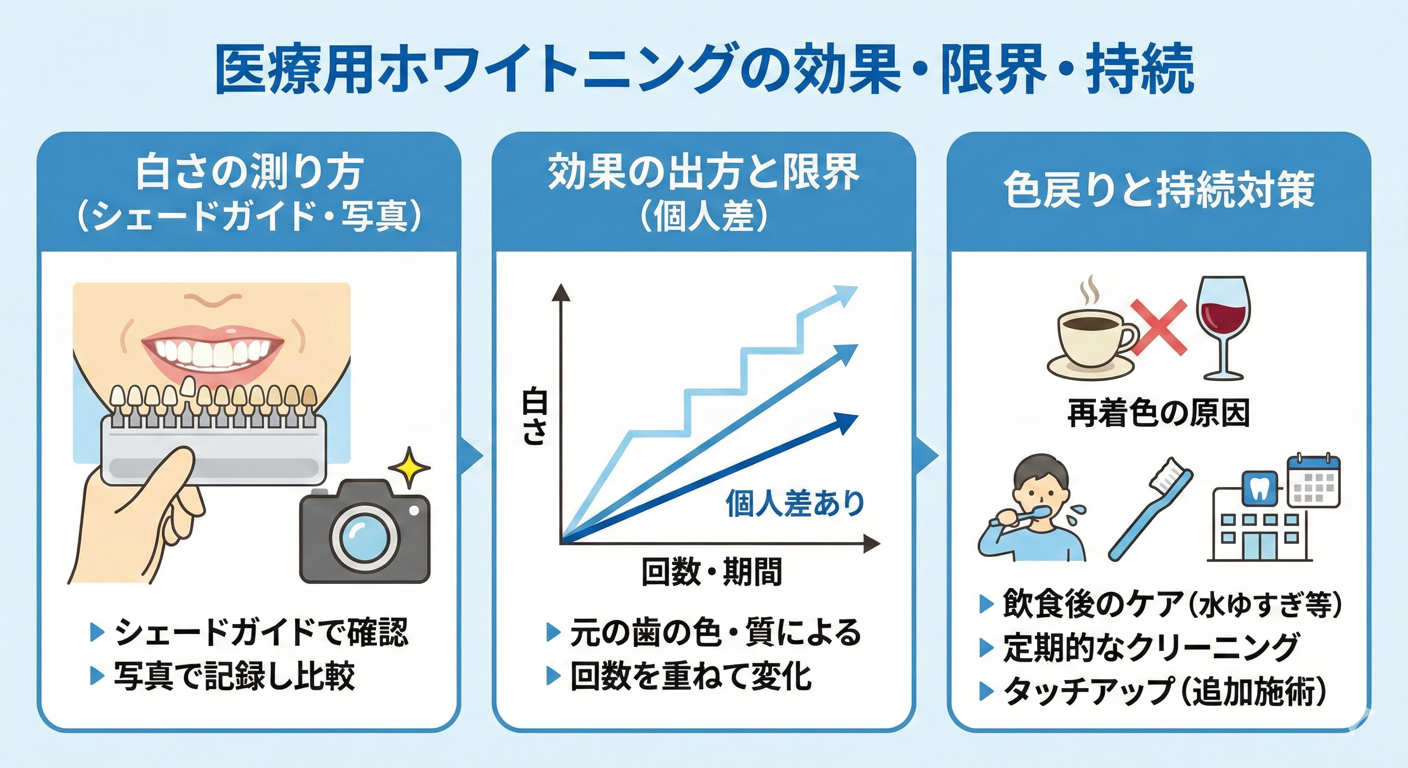 医療用ホワイトニングはどれくらい白くなる?(効果・限界・持続)