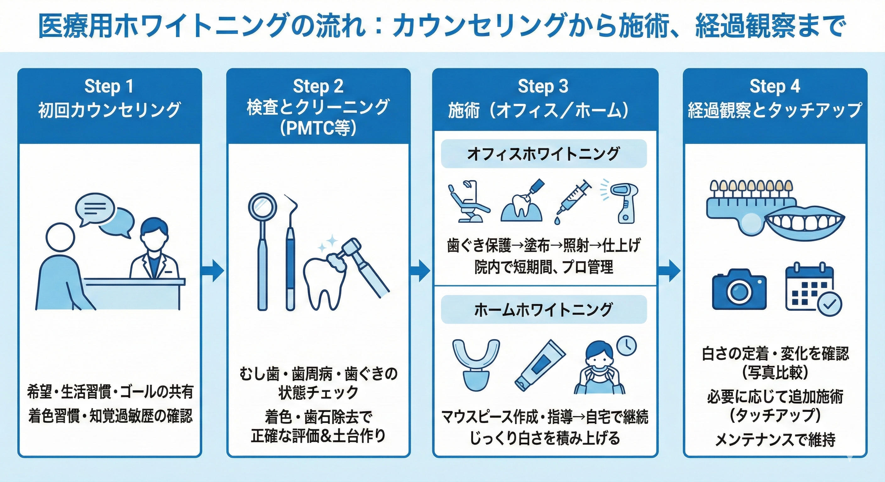 医療用ホワイトニングの流れ(カウンセリング〜施術〜経過観察)