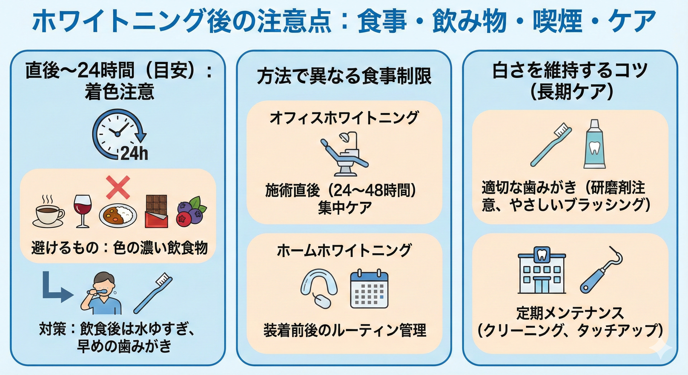 ホワイトニング後は、効果を落とさないための過ごし方が重要です。とくに施術直後は着色しやすい時間帯があるため、期間別にポイントを押さえておくと安心です。色の濃い飲食物を避けるのは、ただのルールではなく理由があります。納得して取り組めると、結果も維持しやすくなります。