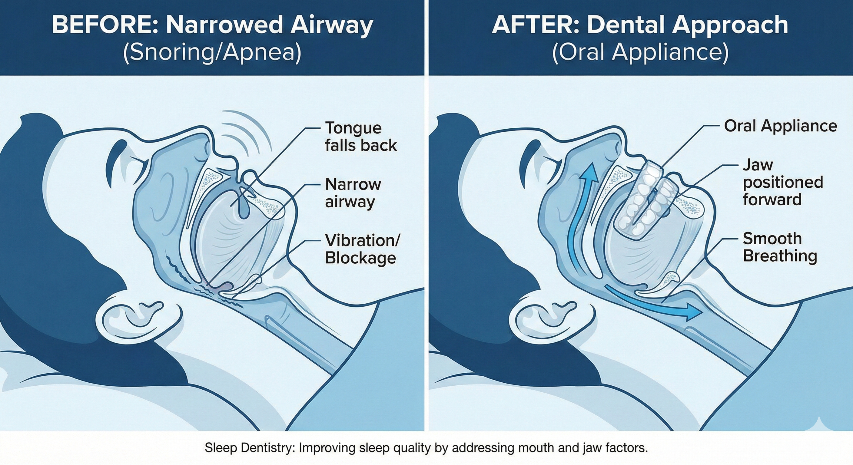 睡眠歯科は、睡眠の質に影響する口や顎の要因を見直し、いびき、睡眠時無呼吸、歯ぎしり・食いしばりなどの悩みに歯科からアプローチする考え方です。いびきや睡眠時無呼吸では、下顎を前方に誘導して気道を確保しやすくする口腔内装置が選択肢になり得ます。歯ぎしりでは、止めるより守る、負担を減らすという目的でナイトガードを用い、歯や顎関節、補綴物を保護します。