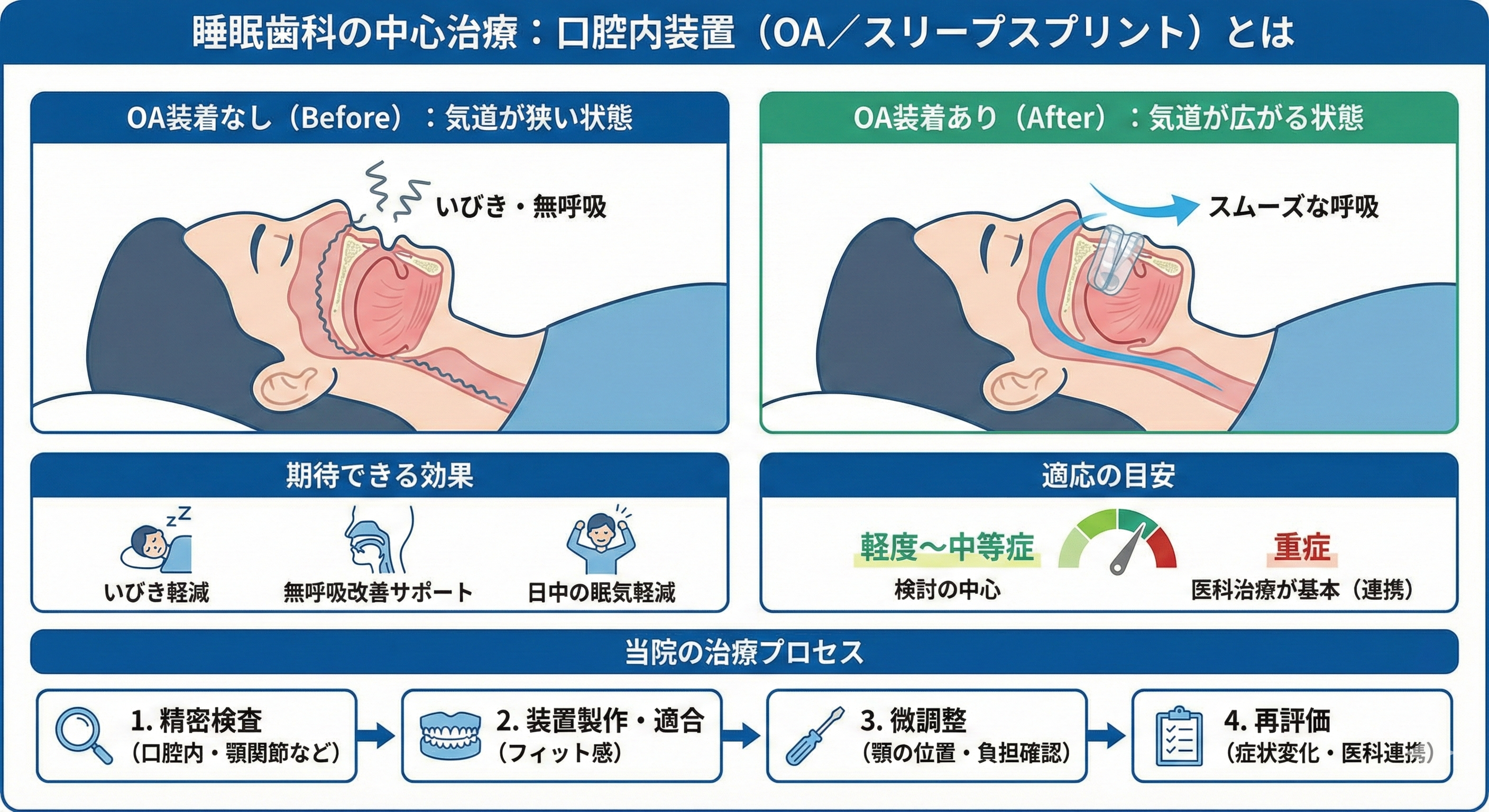 睡眠歯科では、口や顎の状態と睡眠の質の関係に注目し、いびきや睡眠時無呼吸、歯ぎしり・食いしばりなどを扱います。代表的な治療には、下顎を前方に誘導して気道を広げる口腔内装置(OA、スリープスプリント)や、歯や顎を守るナイトガードがあります。