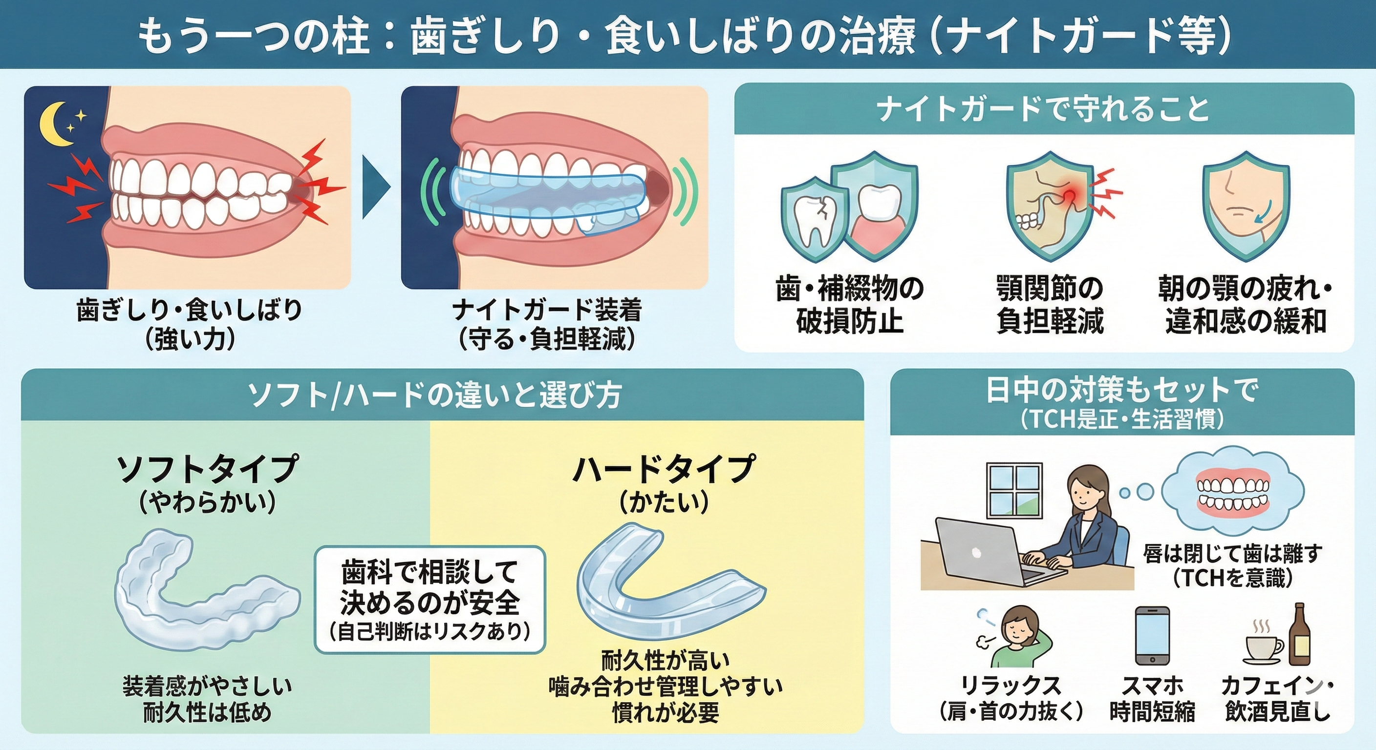 また、顎のだるさ、起床時の顎関節の違和感、こめかみ周辺の疲労感がある方では、夜間の噛みしめが関与していることがあります。ナイトガードは万能ではありませんが、歯と顎を守りながら経過をみる土台として役立ちます。