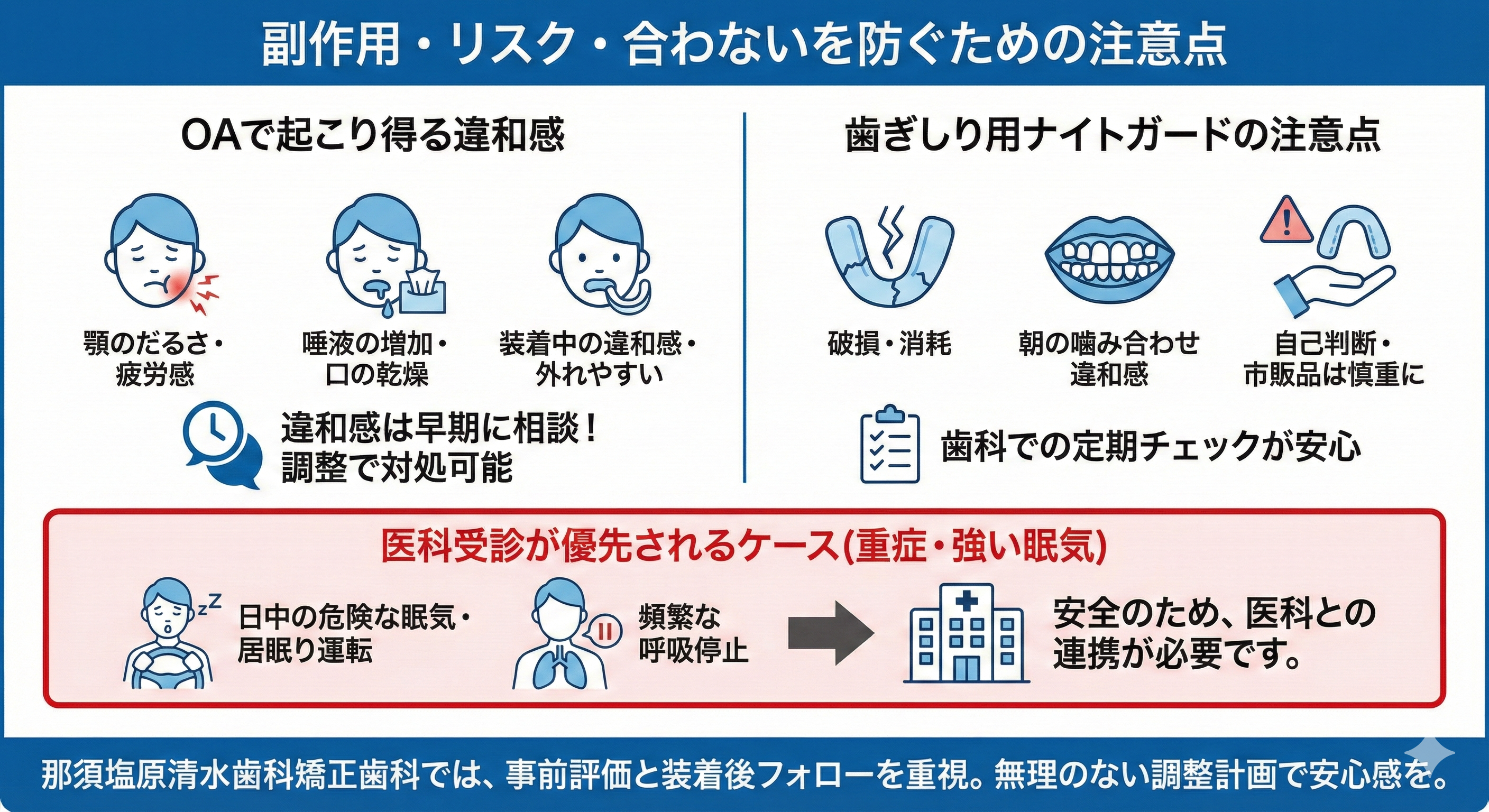OAでもナイトガードでも、最初は装着感に慣れが必要なことがあります。顎のだるさ、唾液が増える、口の乾燥、歯への当たり、朝の噛み合わせの違和感などが出る場合があります。多くは調整や使い方の工夫で改善が見込めますが、症状が強い場合は中断して評価し直す判断も必要です。