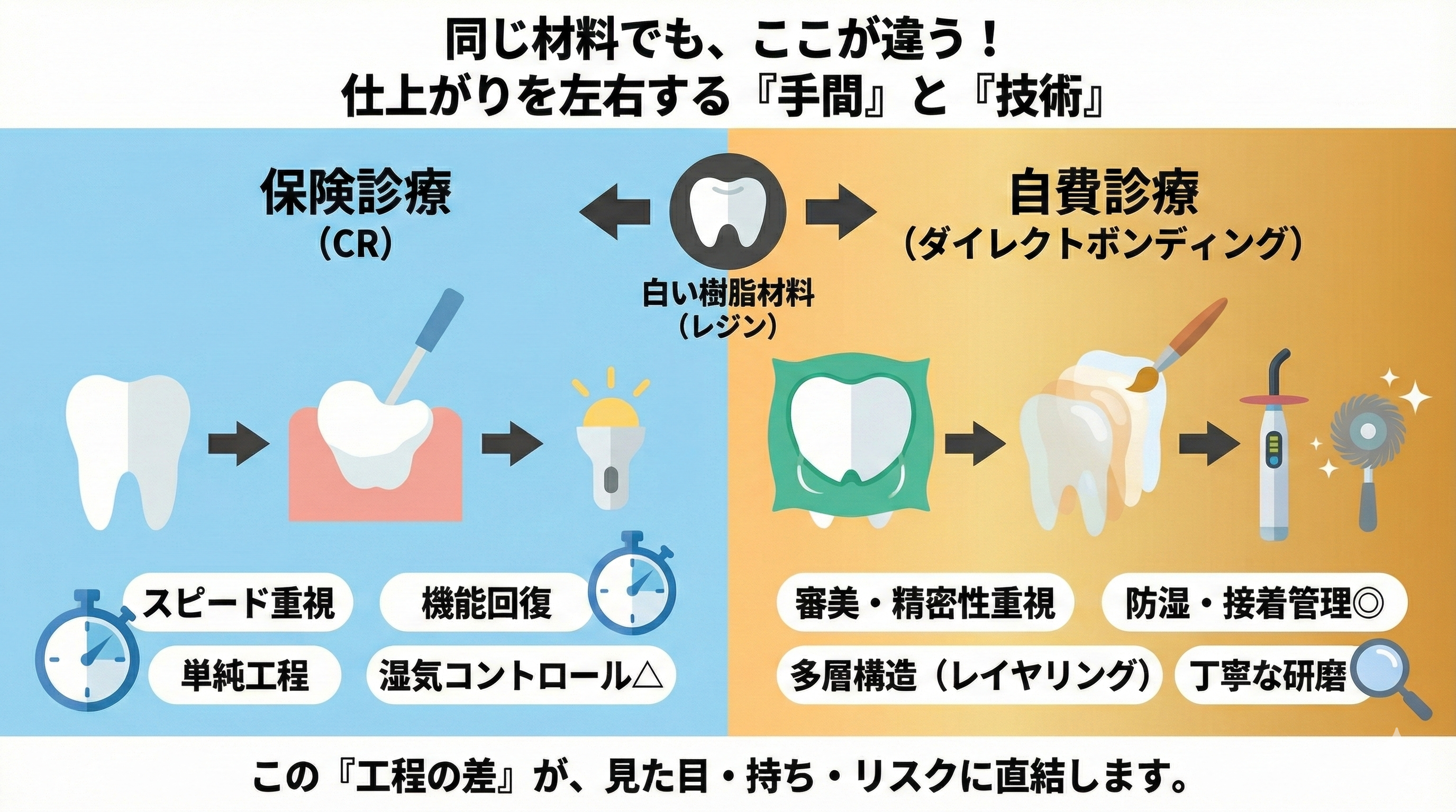 CRもダイレクトボンディングも、結果を左右するのは材料名よりも手順の精密さです。