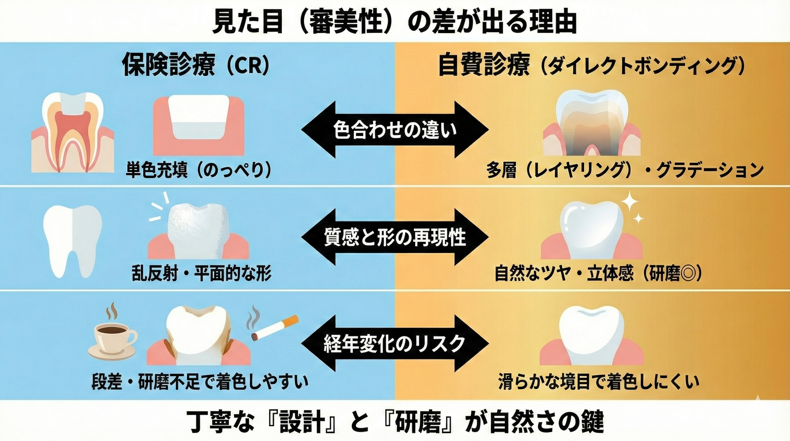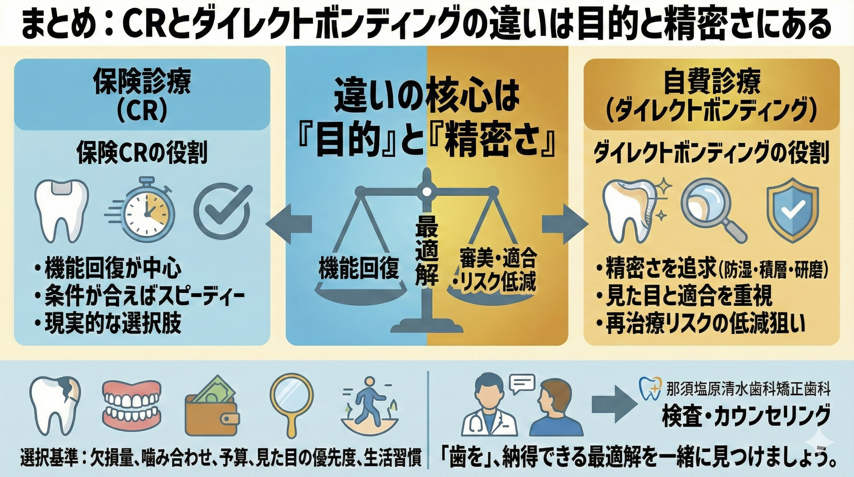 まとめ:CRとダイレクトボンディングの違いは目的と精密さにある