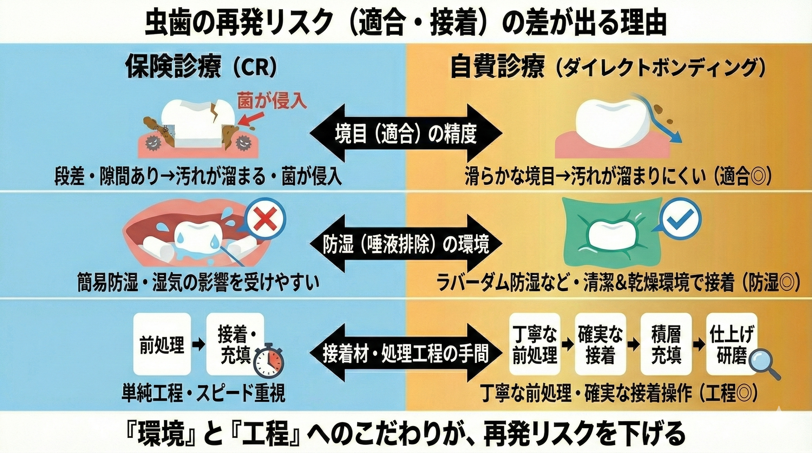 CRとダイレクトボンディングの違い【虫歯の再発リスク(適合・接着)】