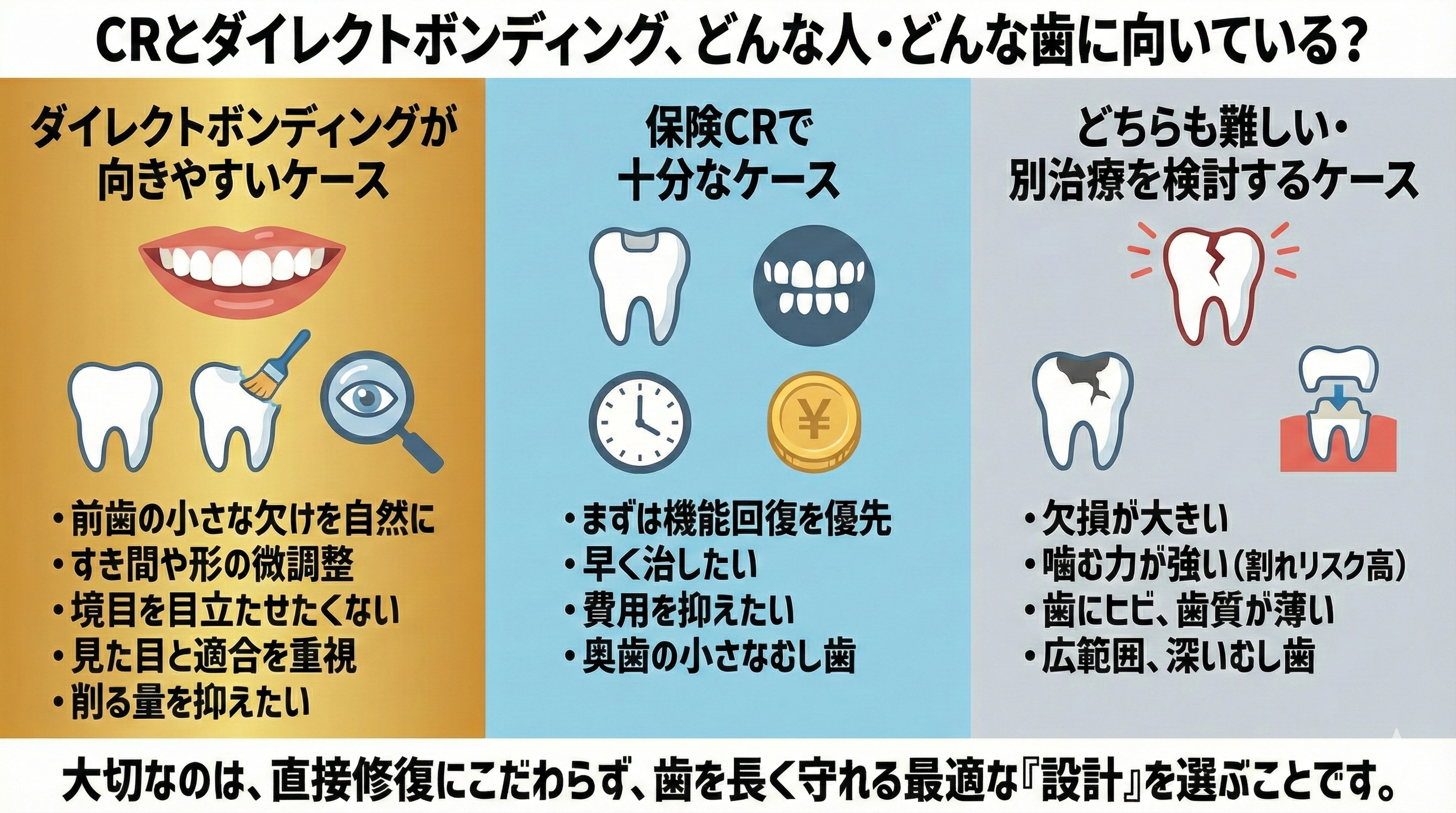 保険CRは、適切な診断と処置で、十分に役割を果たせる治療です。無理に自費を選ぶよりも、今の優先順位に合った方法を選ぶ方が、結果的に満足しやすいこともあります。