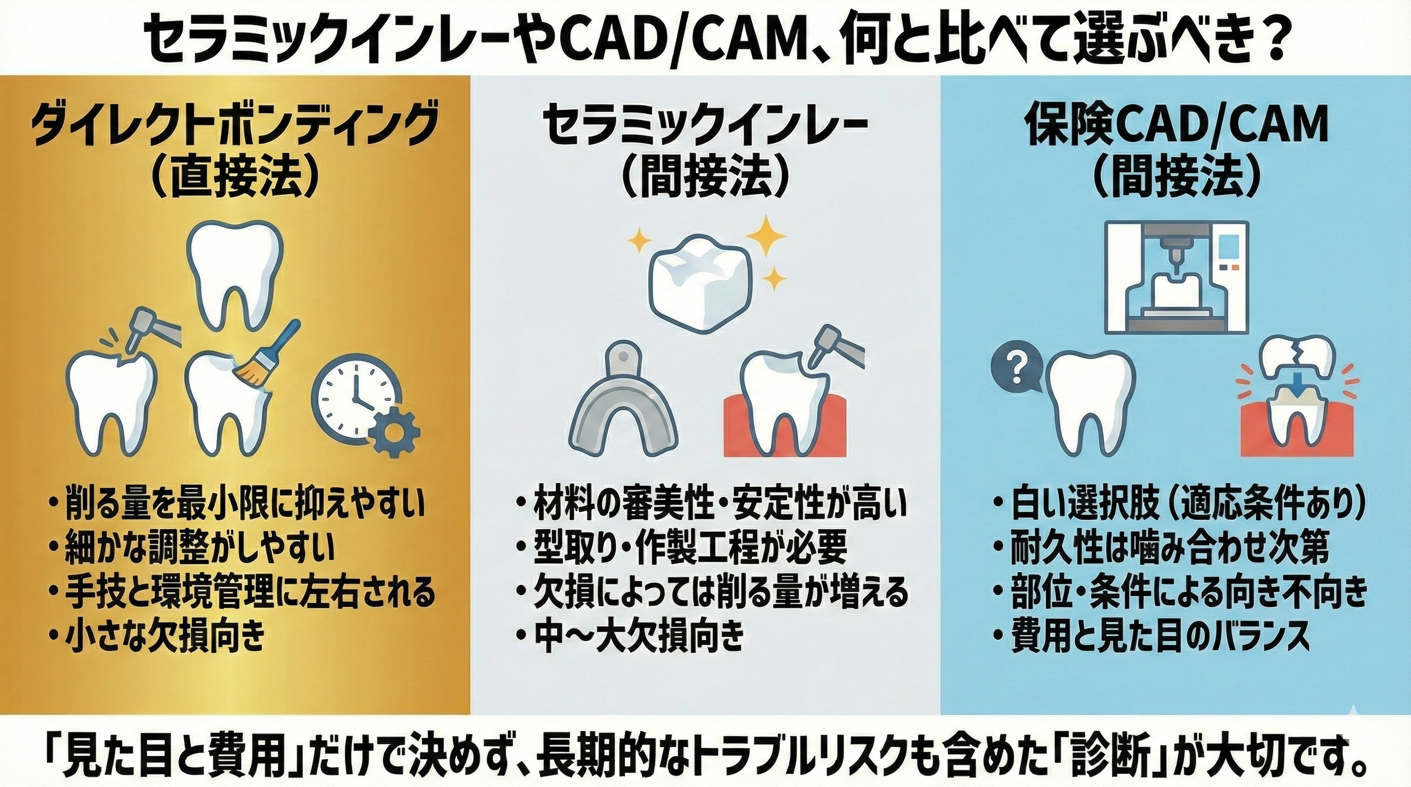 同じ白い治療でも、どれが適しているかは診断が前提です。見た目と費用のバランスだけで決めず、長期的なトラブルリスクも含めて相談するのが安全です。