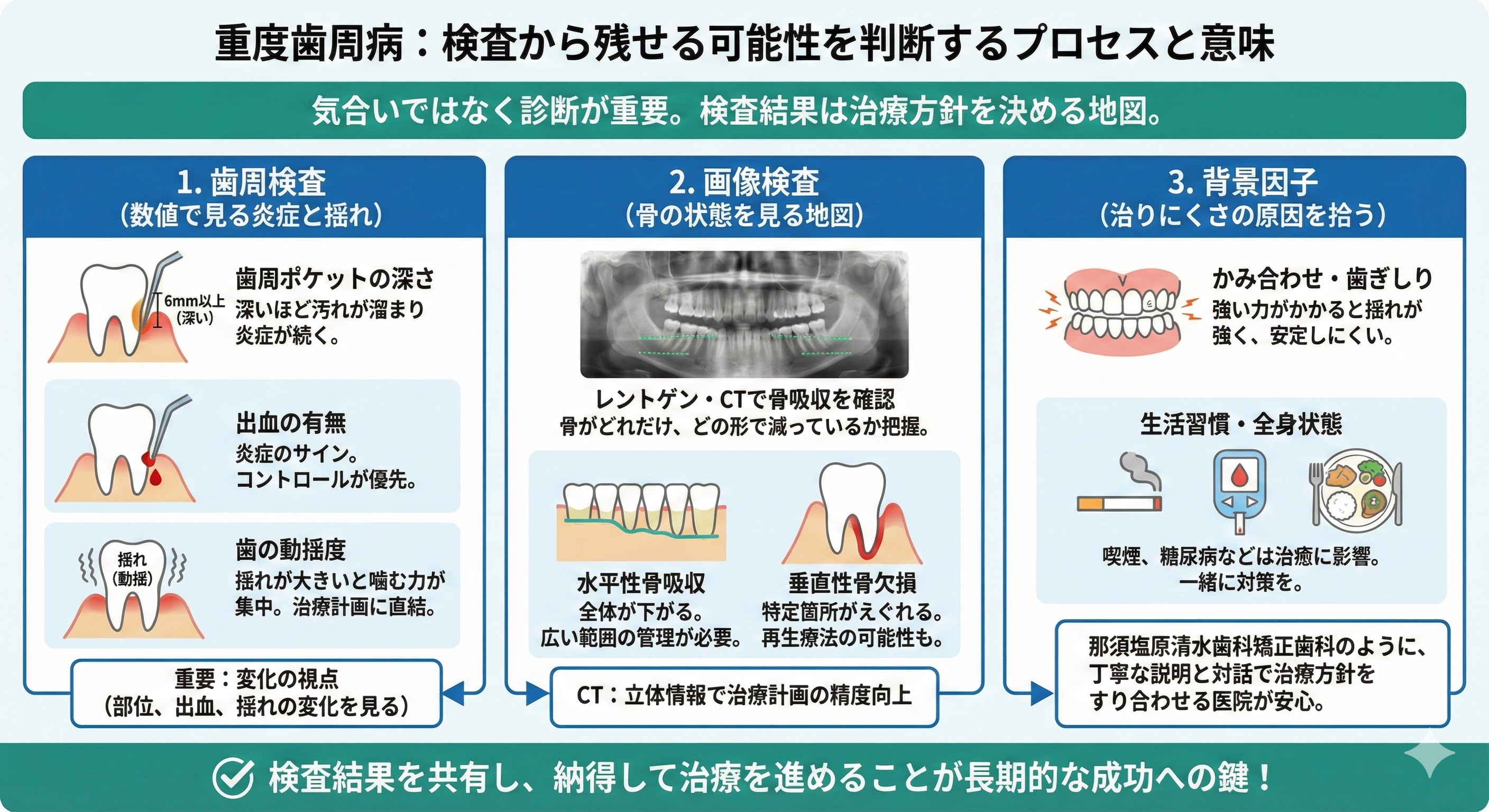 重度歯周病は、痛みが少ないまま進行しやすい一方で、検査をすると残せる可能性や治療の優先順位が整理できます。大切なのは、歯を残すか抜くかを感覚で決めるのではなく、検査結果にもとづいて治療の道筋を立てることです。
