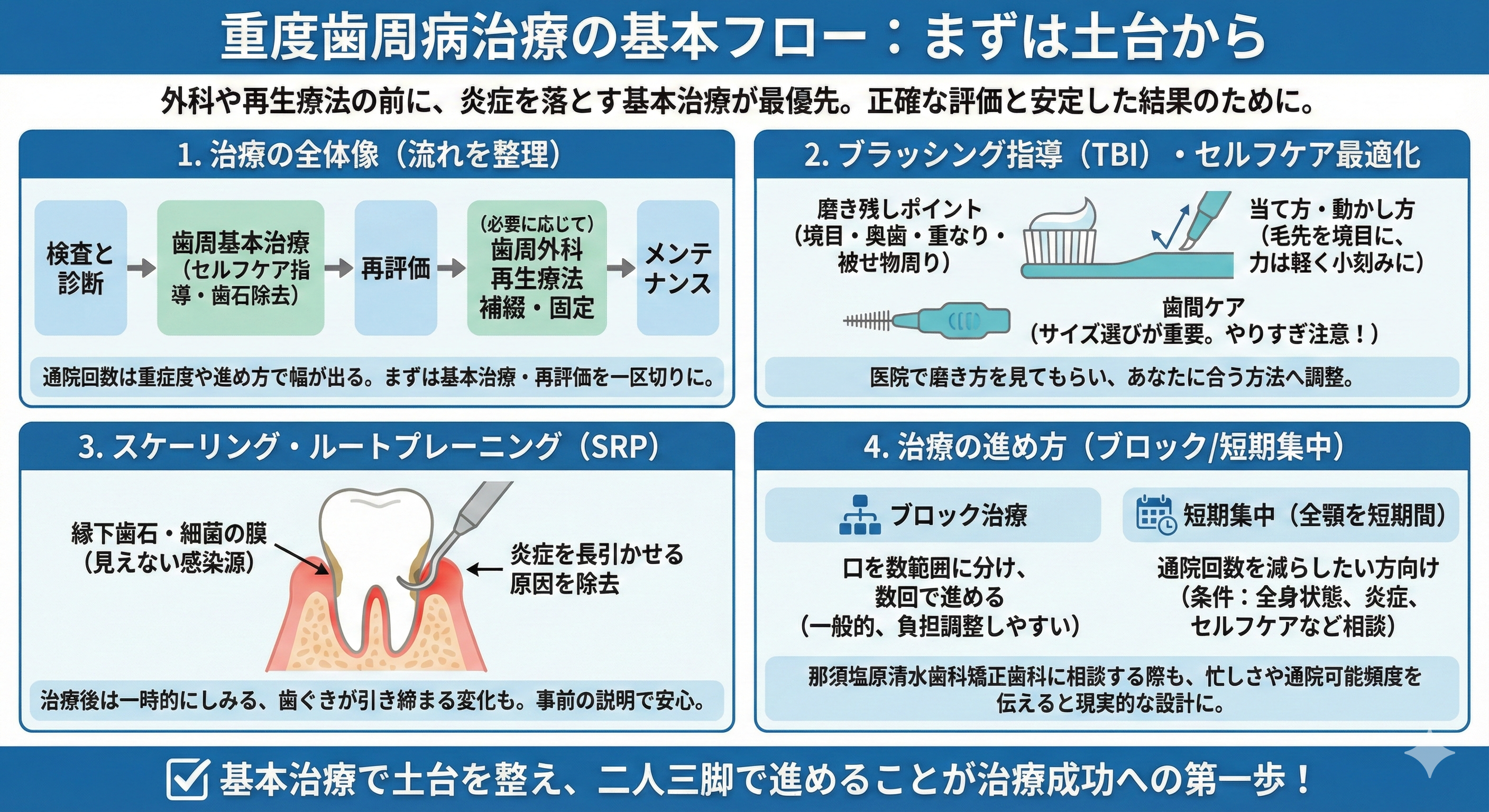 重度歯周病は、検査で状態を正確に把握し、基本治療で炎症を落とし、それでも改善が不十分な場合は歯周外科や再生療法を組み合わせて安定を目指す、という流れで考えると整理できます。