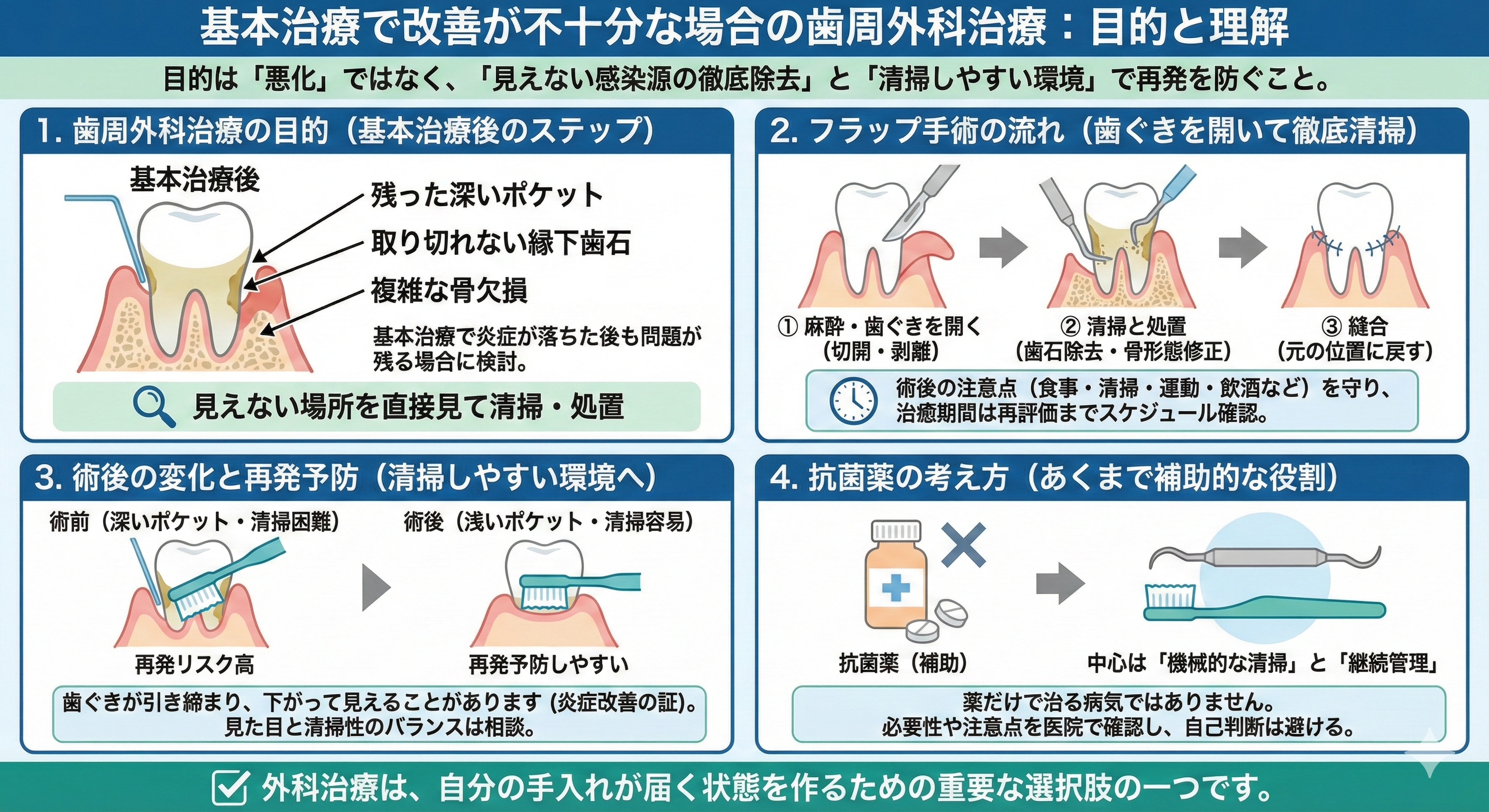 基本治療で炎症が落ちたあとに、まだ深いポケットが残る、縁下歯石が取り切れない、骨欠損が複雑などの場合に検討されます。外科をするかどうかは、検査結果と再評価の結果で決めるのが基本です。