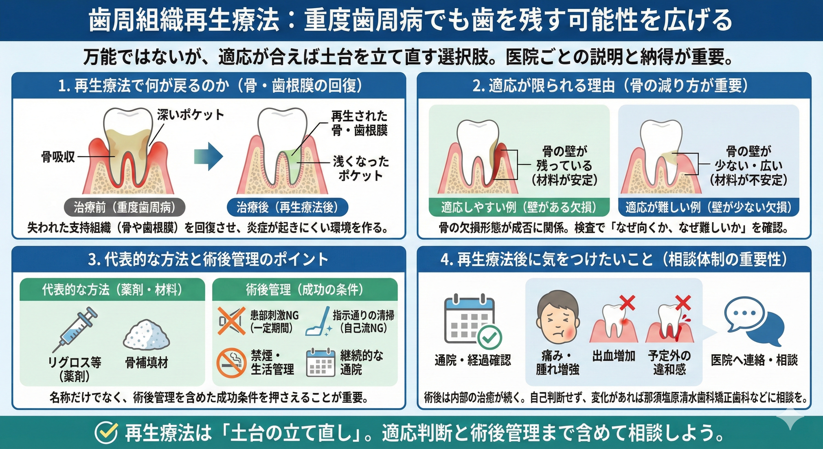 再生療法には、薬剤や材料を用いる方法など、複数の考え方があります。名称だけに注目するより、術後管理を含めた成功条件を押さえることが重要です。