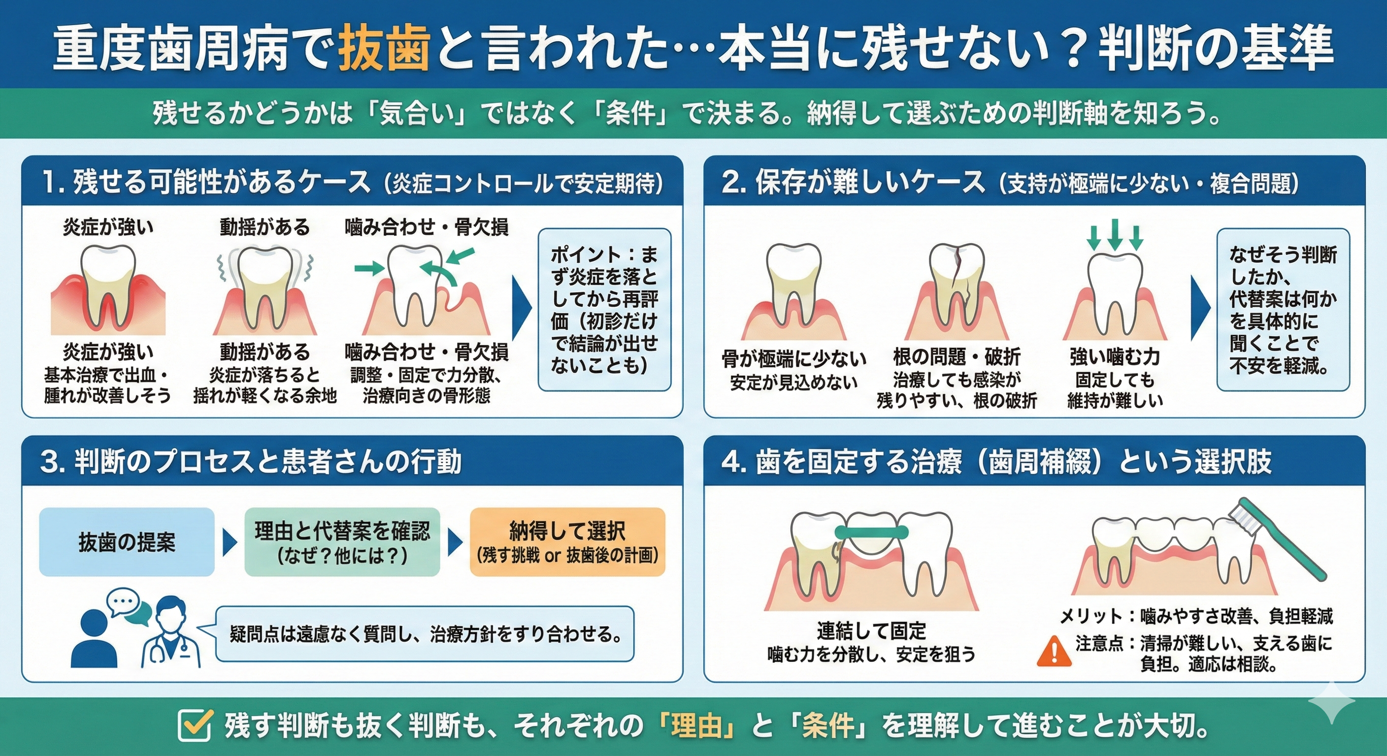 抜歯と言われると、多くの方が歯を残したいという気持ちと、もう無理なのかもしれないという不安の間で揺れます。ここで大切なのは、残せるかどうかが気合いではなく条件で決まるという視点です。