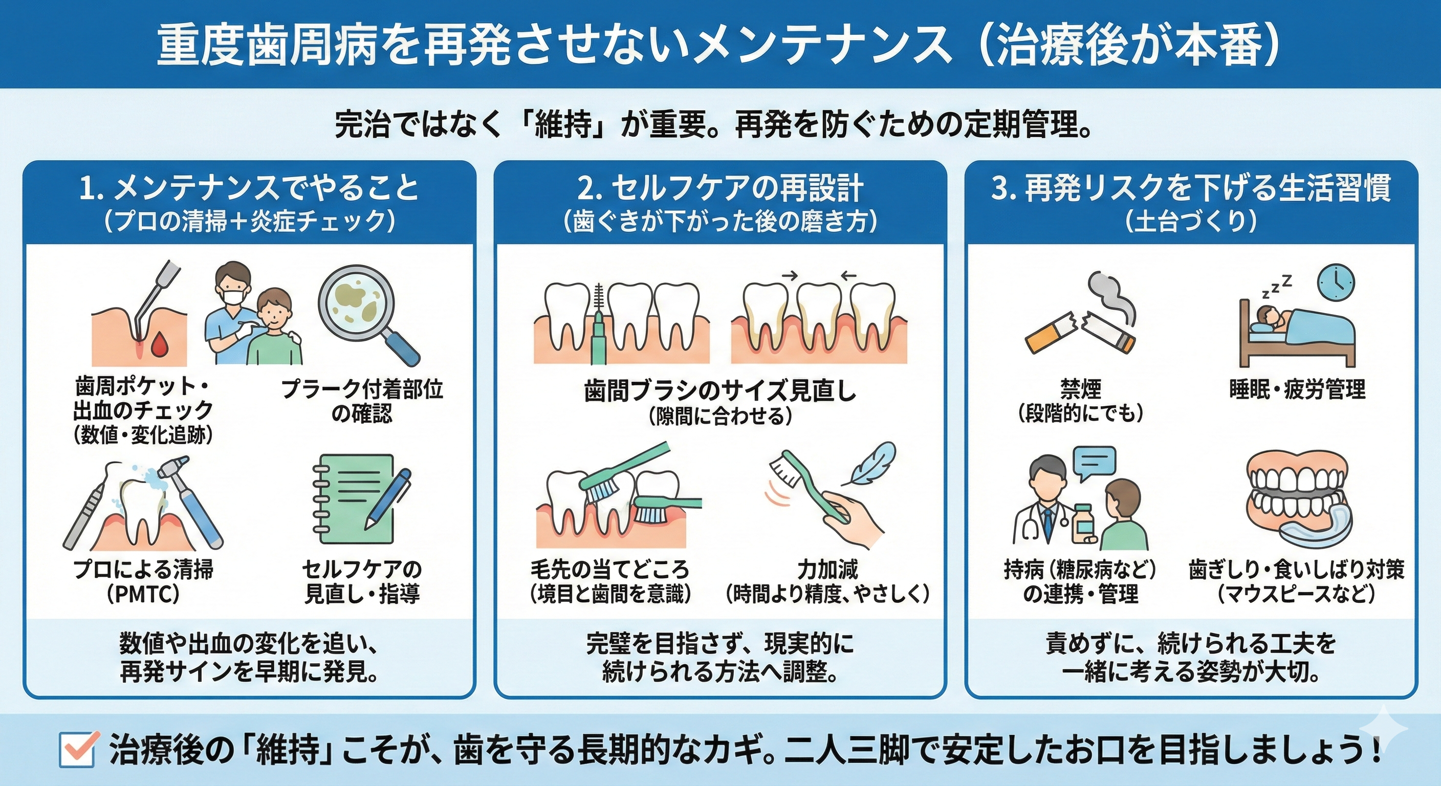 歯周病は、治療が終わったら完治して終了、というタイプの病気ではありません。炎症が落ち着いた状態を維持するために、定期的な管理が必要です。ここを押しつけではなく、再発しやすい性質があるからこそ維持が大事、と理解できると続けやすくなります。