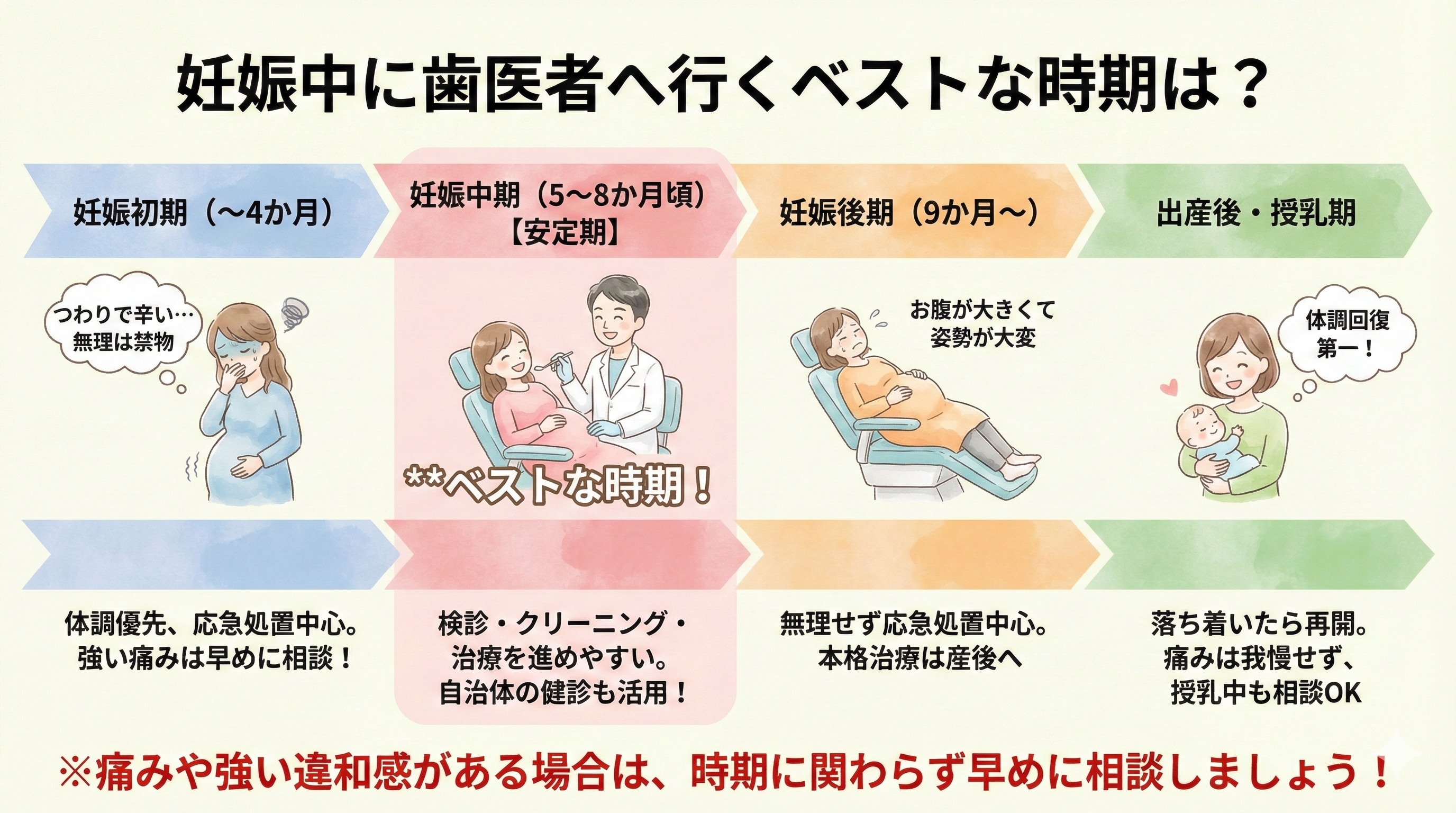 結局いつ行けばいいのか。ここが一番の疑問かもしれません。一般的な目安としては、体調が比較的落ち着きやすい妊娠中期、いわゆる安定期が受診の中心になります。ただし、痛みや腫れ、強い違和感がある場合は時期に関係なく相談してよい、というのが大前提です。