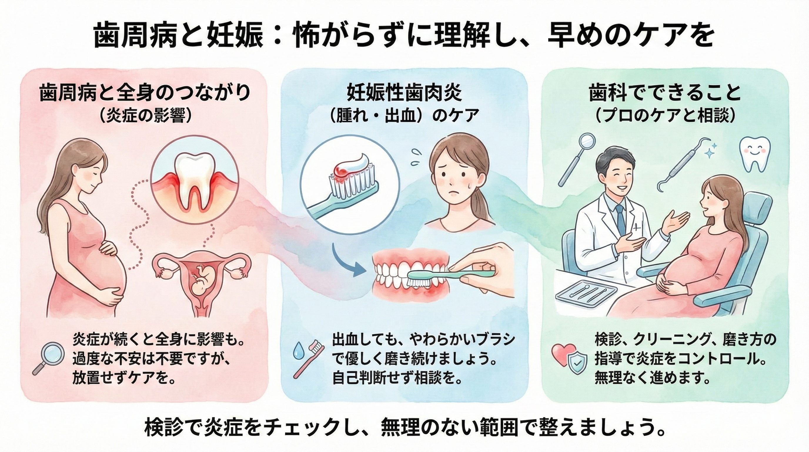 妊娠中は歯ぐきが敏感になり、出血しやすくなることがあります。ただ、出血の背景に炎症がある場合は、放置すると続きやすいこともあります。血が出るから磨かない、という方向に行くと汚れが残りやすくなり、悪循環になりがちです。