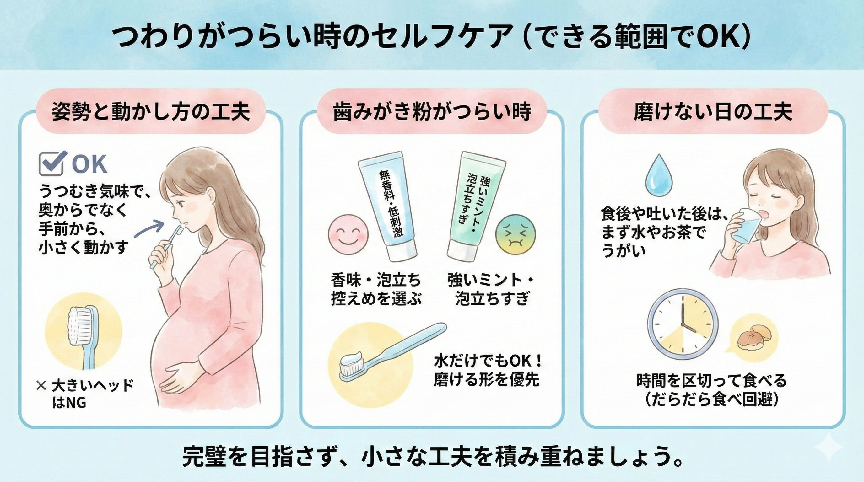 つわりの時期は、完璧なケアを目指すほど苦しくなってしまうことがあります。大切なのは、できる範囲で、口の中が酸性に傾く時間を減らし、汚れを残しにくくする工夫を積み重ねることです。