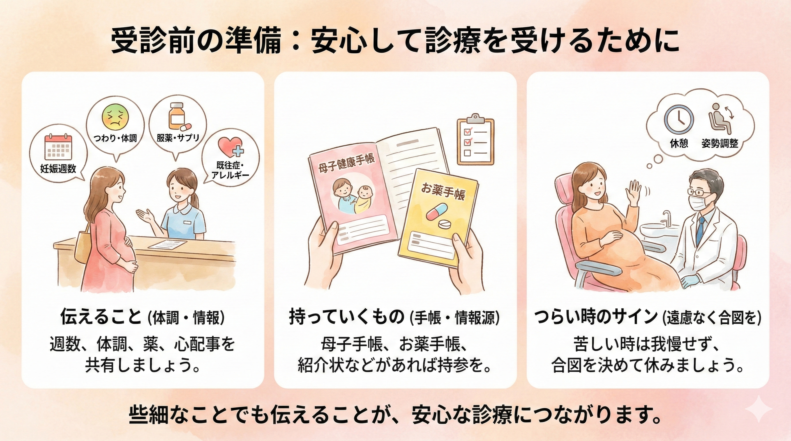 妊娠中の歯科受診は、準備ができているだけで不安がぐっと減ります。ポイントは、妊娠週数と体調、服薬情報を共有すること。そして、途中でつらくなったら中断できると知っておくことです。