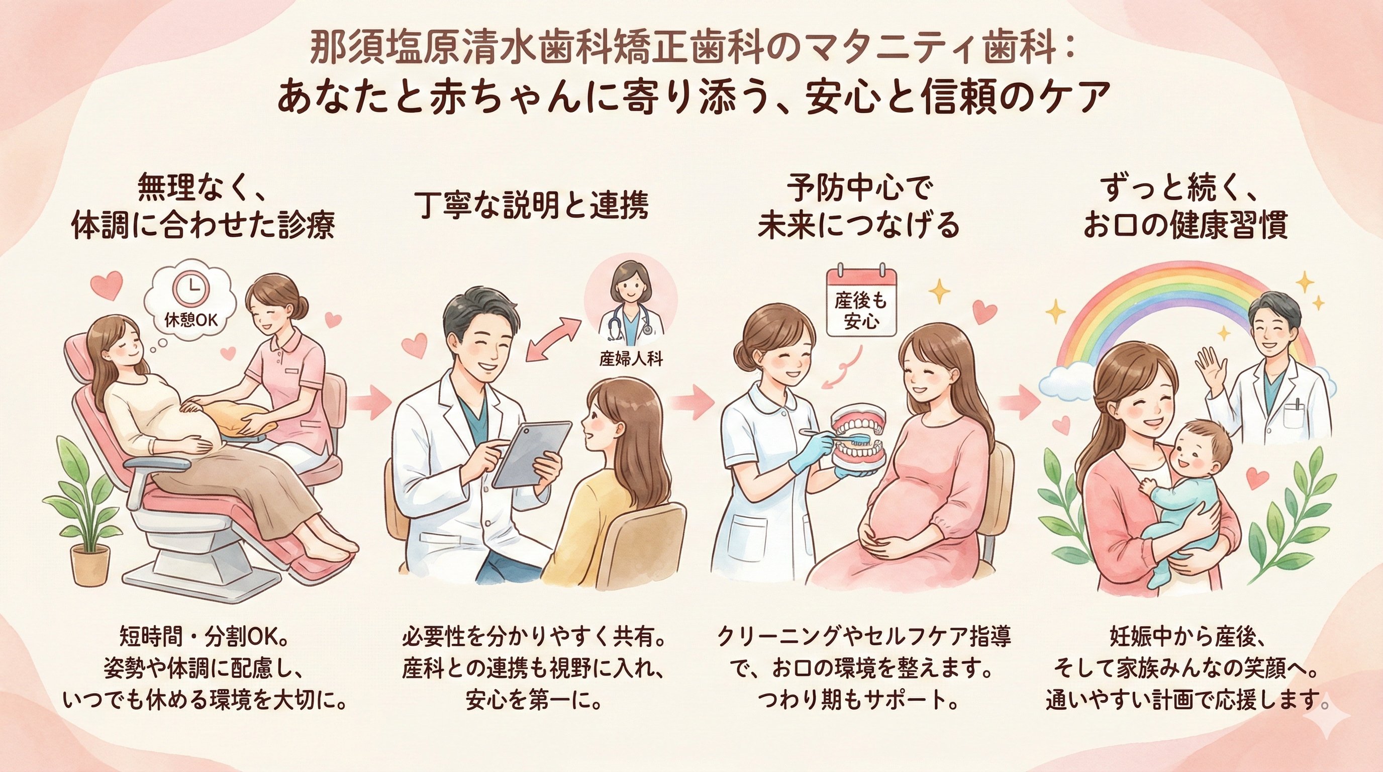 那須塩原清水歯科矯正歯科では、妊娠中のケアをゴールにせず、産後の再開や家族の予防にもつながるように、無理のないセルフケア設計と通院計画の提案を大切にしています。