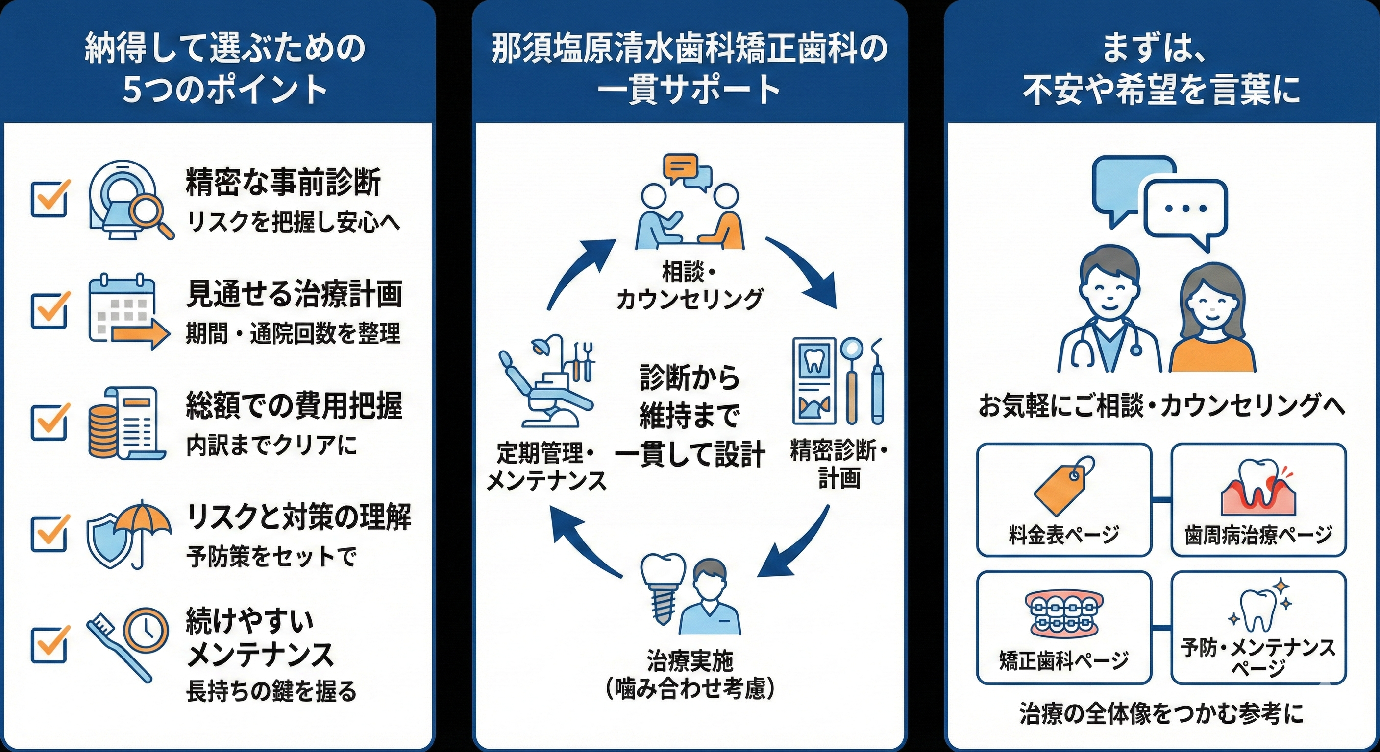 那須塩原清水歯科矯正歯科では、精密な診断と説明、噛み合わせまで含めた設計、治療後の定期管理まで一貫して考え、患者さんが不安を整理して選べる状態を大切にしています。まずは、不安や希望を言葉にするところから始める相談・カウンセリングをご利用ください。あわせて、料金表、歯周病治療、矯正歯科、予防歯科・メンテナンスの各ページも参考にしていただくと、治療の全体像がつかみやすくなります。