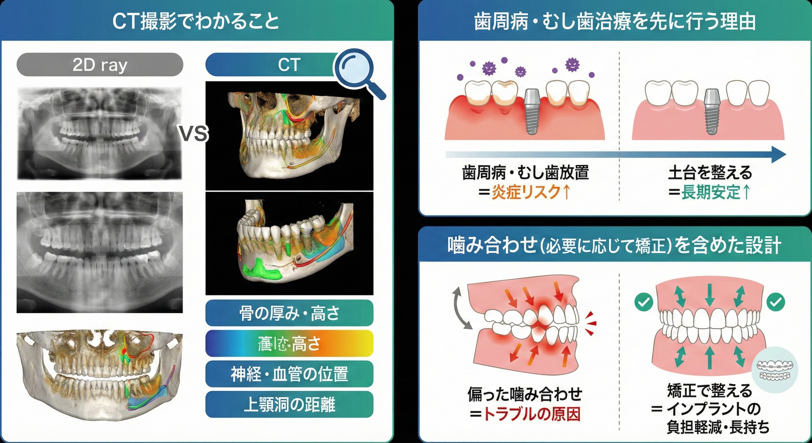 CTを含む検査で立体的に把握し、無理のない位置と角度を計画することが、リスク低減の基本です。当院では、検査結果をもとに、なぜその計画になるのかを説明し、患者さんが納得して進められるようにしています。