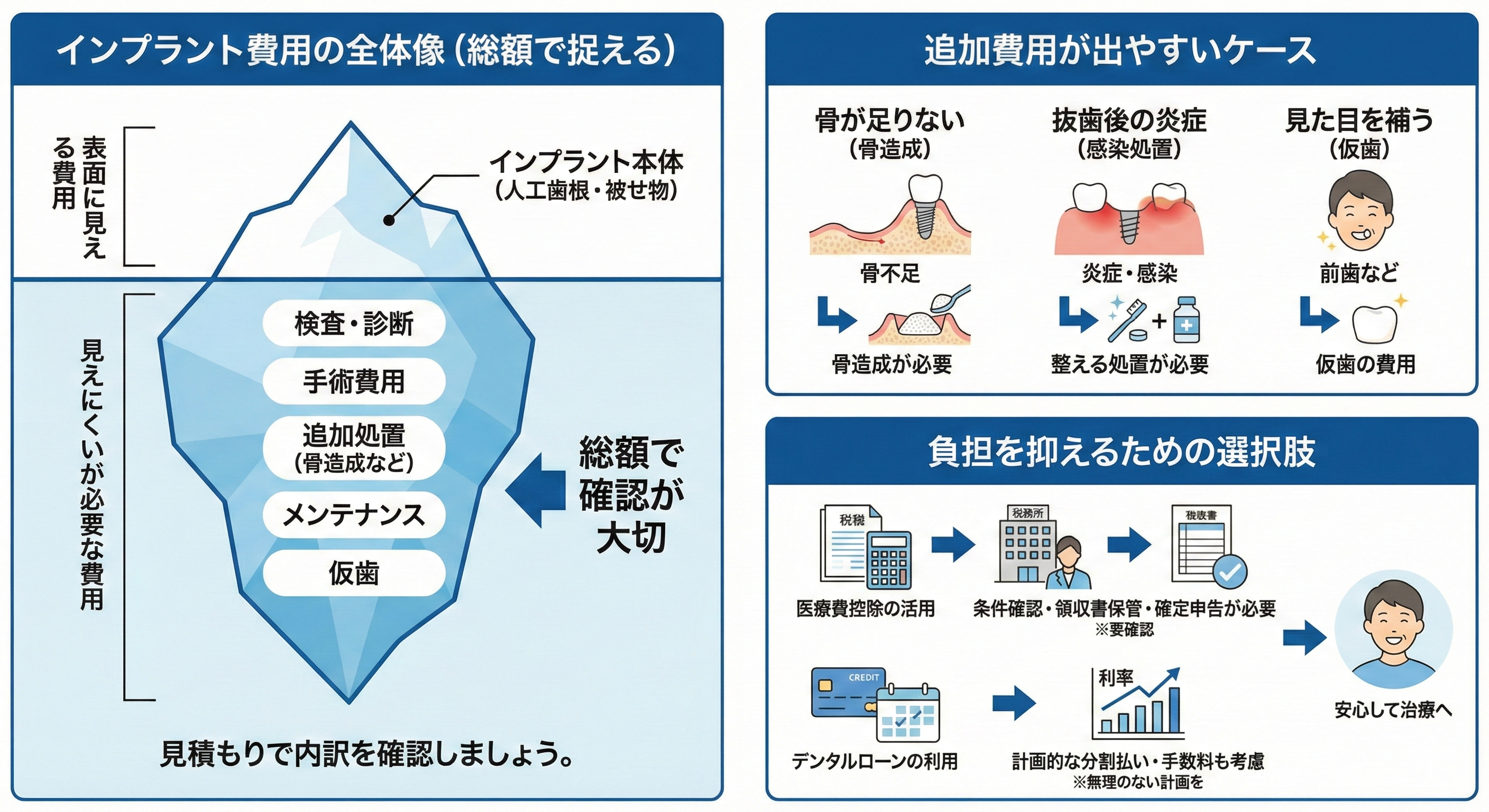 インプラント治療では、条件によって医療費控除の対象になる場合がありますが、適用の可否や必要書類、申告方法は個別条件によって異なります。そのため、制度の存在を知ったうえで、領収書を保管しておく、疑問があれば税務署や専門家に確認する、医院側にも必要な書類について相談する、といった実務面の準備が現実的です。