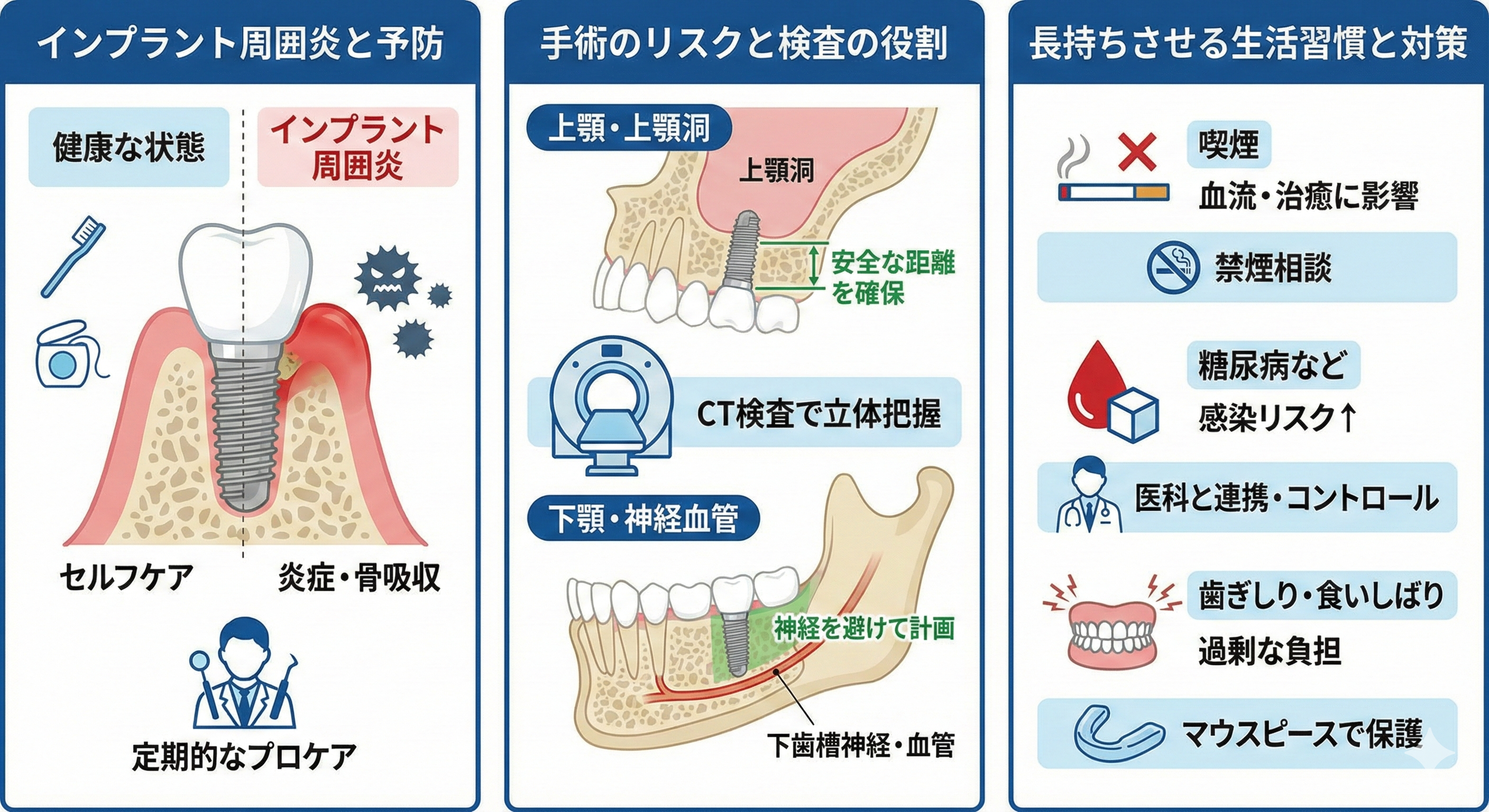 リスクの話は不安になりやすい一方で、知っておくことで対策が取りやすくなる分野です。インプラントは外科処置を伴うため、ゼロリスクではありません。ただ、事前診断、治療計画、術後の管理を丁寧に行うことで、リスクを下げられることも多いです。