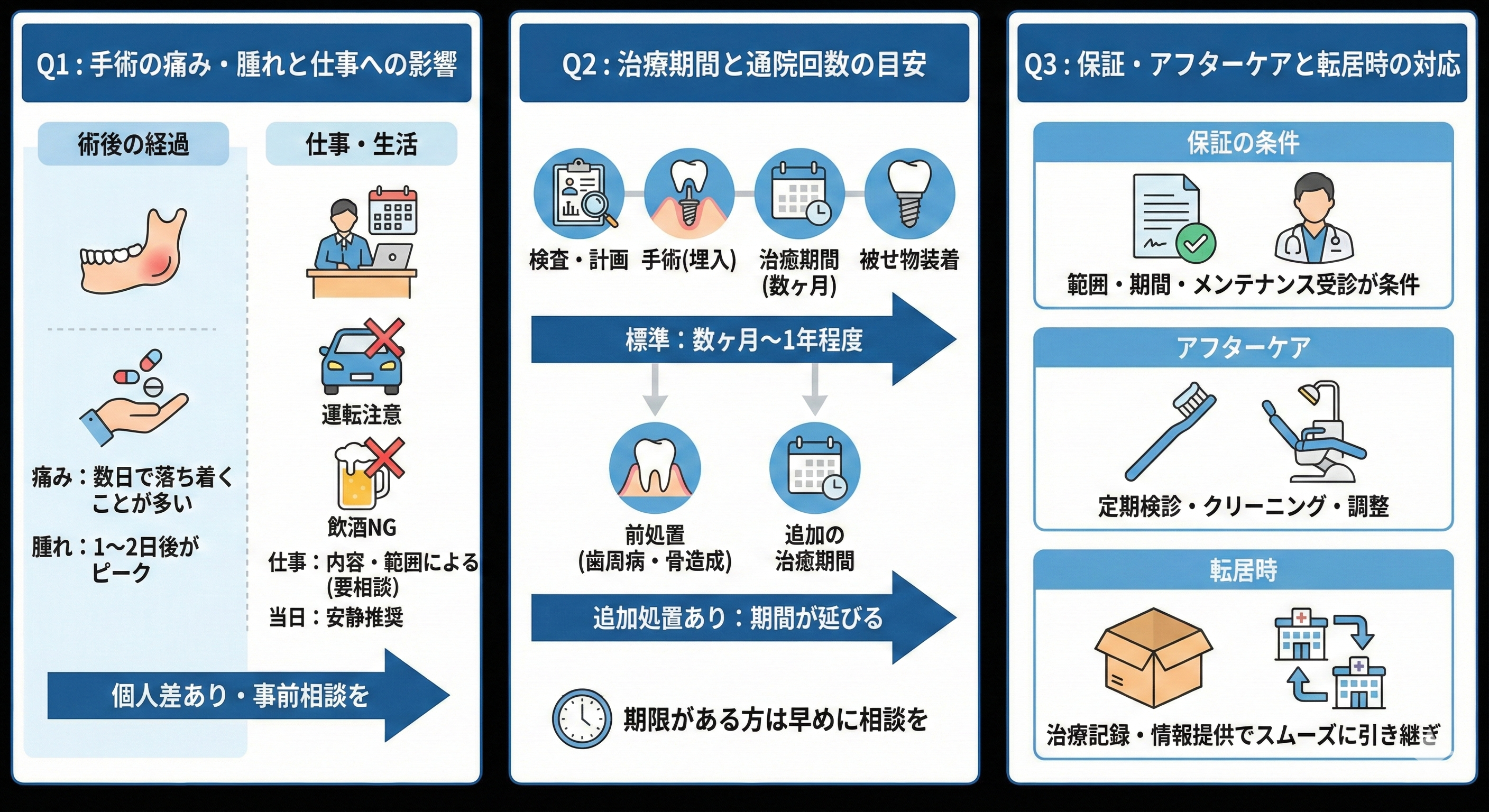 保証やアフターケアは、条件が付くことが多いのが一般的です。たとえば、保証の範囲はどこまでか、期間はどれくらいか、定期メンテナンスの受診が条件になるか、といった点は事前に確認することが大切です。転居した場合でも、治療内容や使用部品などの情報が分かると引き継ぎがスムーズになるため、治療記録や説明資料の扱いについても相談しておくと安心です。当院でも、治療後の管理を見据えて、必要な情報提供の考え方を説明します。